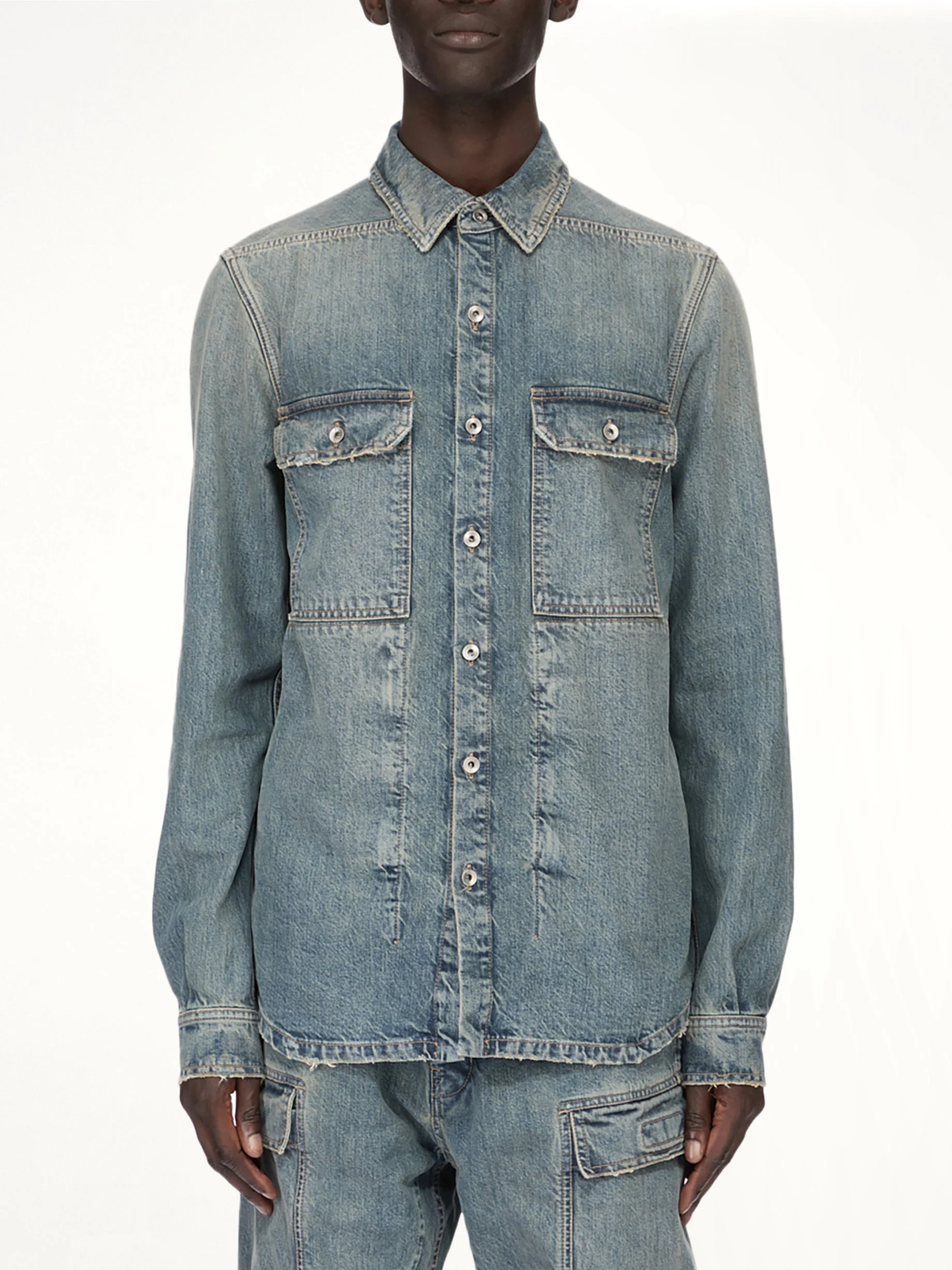 Rick Owens DRKSHDW's Denim Outershirt in Washed Indigo is a versatile piece that combines contemporary style with classic denim appeal. This outershirt is designed for those who appreciate a blend of comfort and edgy fashion. - Composition: 100%Cotton-Inside Pockets 52%Polyester-48%Cotton- - Washed indigo finish for a unique, worn-in look - Button-up front closure for easy layering - Two chest pockets for added functionality - Relaxed fit for a comfortable wear - Signature Rick Owens DRKSHDW design elements - Made in Italy Model is 187 cm and wears size M SKU: DU01F4755 DWB 06