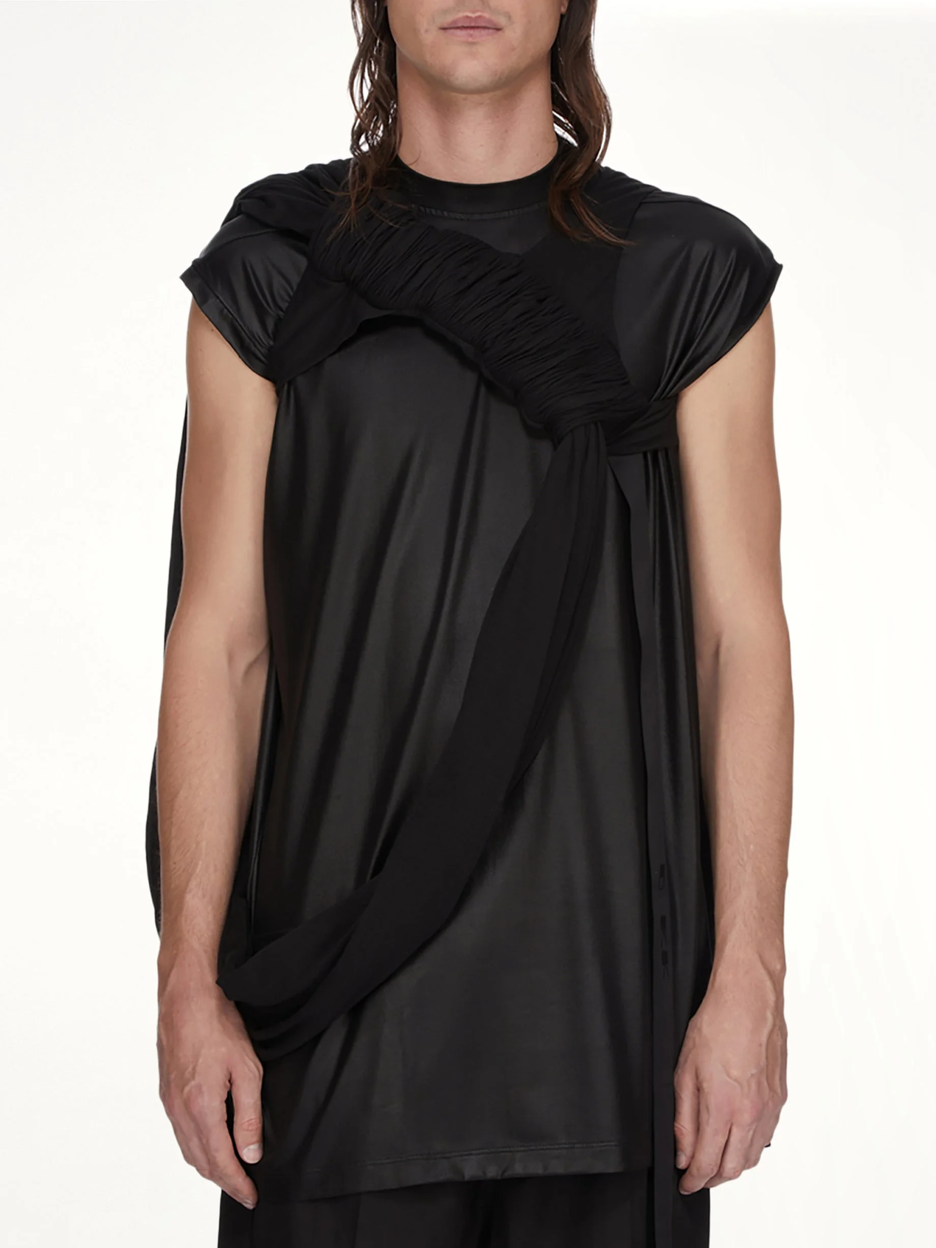 Rick Owens DRKSHDW's Harness Tank in Black is a bold and avant-garde piece that embodies the designer's signature aesthetic. This tank top features a unique harness detail, adding an edgy twist to a classic silhouette. - Composition: 100%Cotton- - Sleeveless design with a relaxed fit - Distinctive harness detail across the chest - Minimalist black colorway - Perfect for layering or as a statement piece - Made in Italy Model is 187 cm and wears size M SKU: DU01F4168 BHDB 09