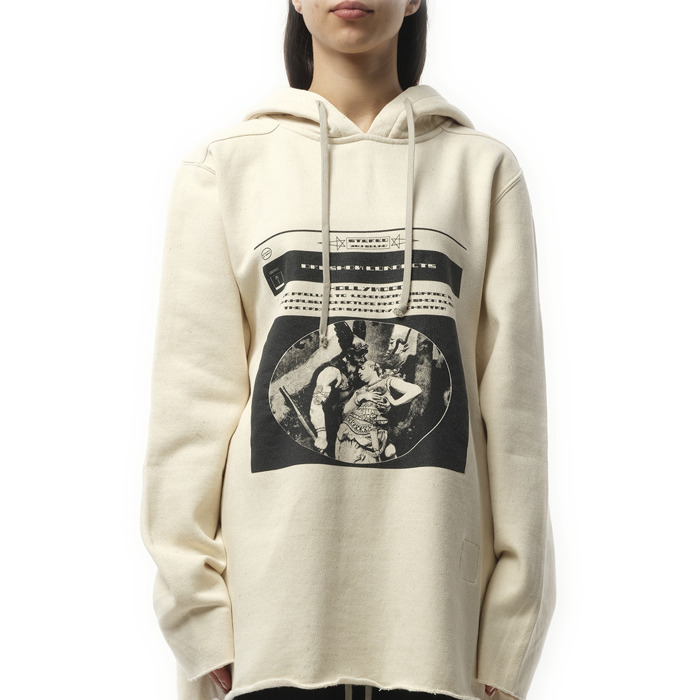 Rick Owens DRKSHDW's Opera Print Oversize Hoodie in Natural/Black, this oversized hoodie from Rick Owens's DRKSHDW line combines avant-garde design with everyday comfort. Crafted from heavyweight organic cotton fleece, it features a distinctive opera print, adding an artistic flair to your casual wear. This is a statement piece for those seeking both style and comfort. - Composition: 100% Cotton - Hip-length with a loose, oversized fit and long sleeves - Adjustable drawstring hood - Opera-themed graphic on the front - Natural body with black print - Made in Portugal Model is 175 cm and wears size XS. SKU: DS01E3241 FNEP1P 2109