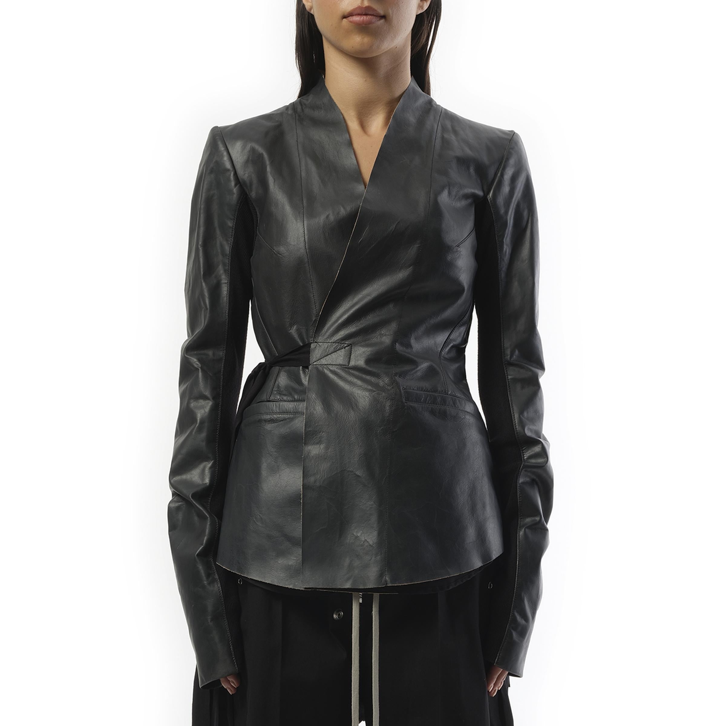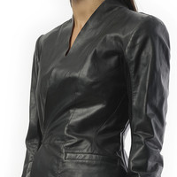 This Hollywood Leather Jacket in Black is the epitome of cool and sophistication. Made from premium leather, it features a sleek design with a comfortable fit. Perfect for any occasion, this jacket will elevate your style and provide excellent protection from the elements. - Composition: 100% Calf Leather - V neck - Self-tie fastening - Long sleeves - Made in Italy Model is 175 cm and wears size 40 SKU: RP01E7749 LTP 09