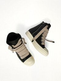 Rick Owens's Jumbolace Sneaks in Black/Milk/Milk is a bold statement piece that combines avant-garde design with everyday functionality. These sneakers feature a striking color palette and oversized laces, making them a standout addition to any wardrobe. - Composition: Upper 100%Cow Leather-Toe 100%Calf Leather-Lining 100%Calf Leather-Insole 100%Calf Leather-Sole 100%Thermoplastic Rubber- - Color: Black/Milk/Milk - Oversized laces for a unique look - Chunky sole for added comfort and style - High-top design for ankle support - Signature Rick Owens aesthetic - Made in Italy SKU: RP02E4878 LCOW2 911