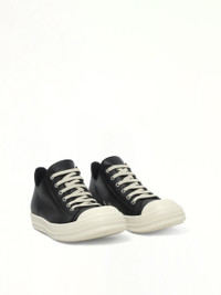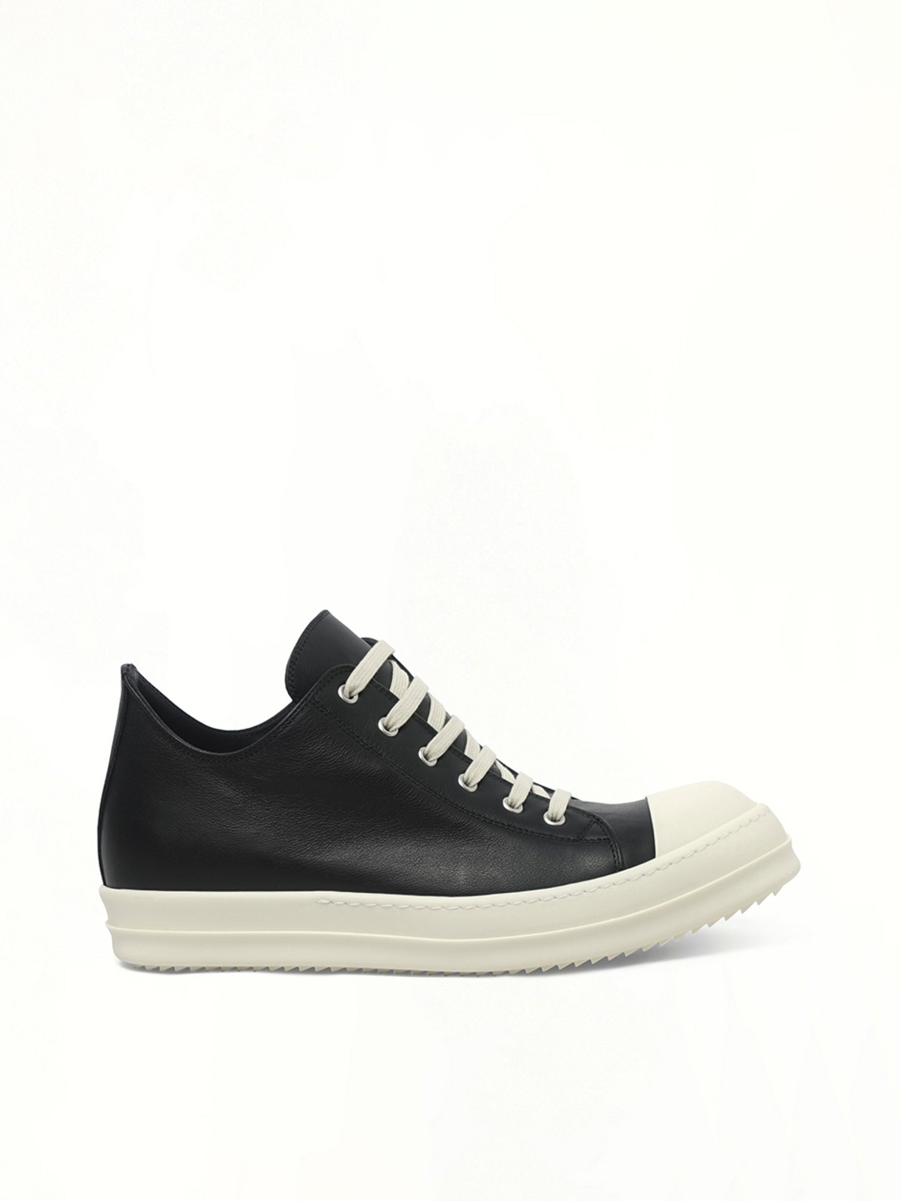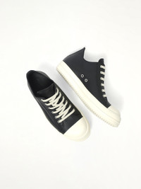 Rick Owens's Low Sneaks in Black/Milk/Milk is a striking blend of avant-garde design and everyday functionality. These sneakers offer a bold aesthetic with their contrasting color palette and unique silhouette. - Composition: Upper 100%Cow Leather-Toe 100%Calf Leather-Lining 100%Calf Leather-Insole 100%Calf Leather-Sole 100%Thermoplastic Rubber- - Features a low-top design for versatile styling. - Distinctive black and milk color combination. - Chunky sole for added comfort and height. - Lace-up closure for a secure fit. - Signature Rick Owens design elements. - Made in Italy SKU: RU02E1891 LCO 911