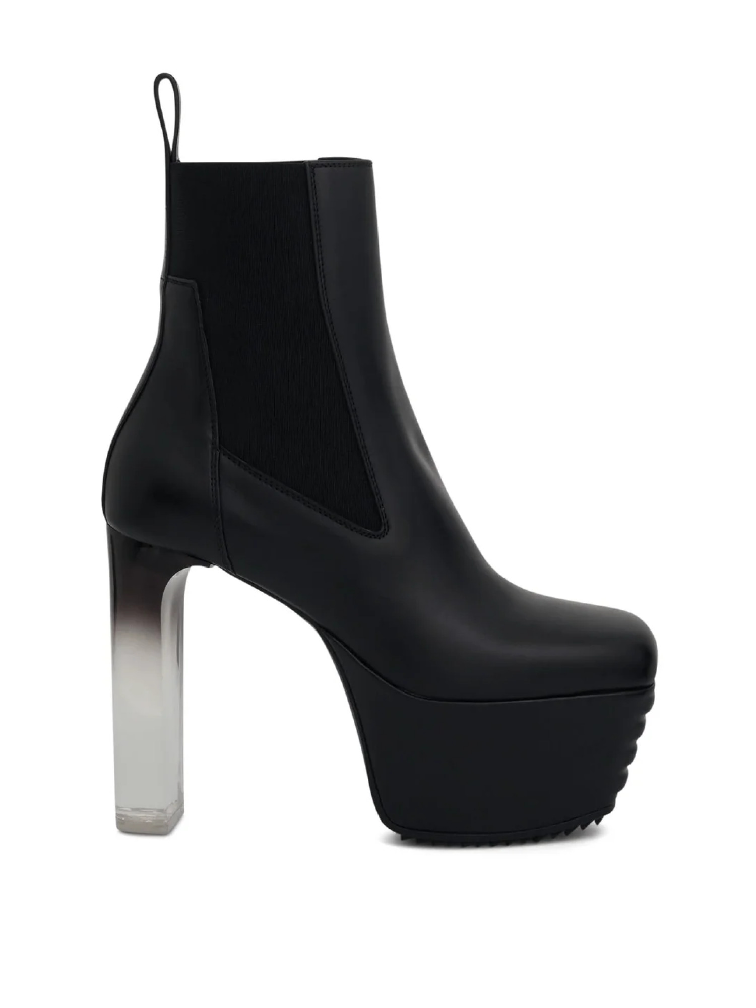 Minimal Grill Beatle ankle boots from renowned designer Rick Owens. Exuding a captivating allure, these ankle boots are crafted from sleek black leather. The standout feature of these boots is the sky-high gradient transparent heel, adding a mesmerizing and futuristic touch to the design. - Composition:100% Calf leather - Pull-tab at the heel - Elasticated side panels - Square toe - Above knee-length - Platform sole - Transparent block heel SKU: RO01C5847 LGWDEG 990D