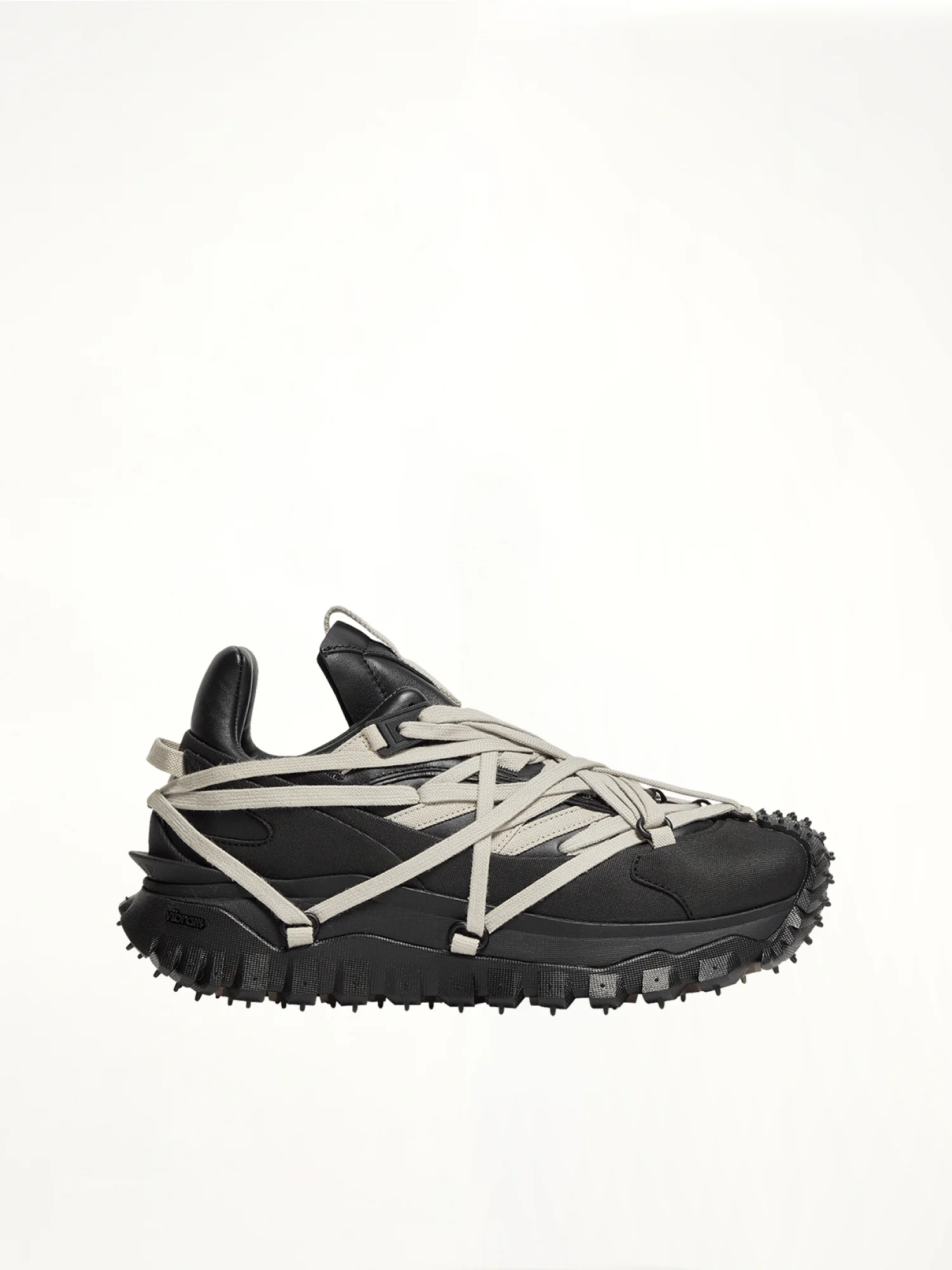 This Moncler + Rick Owens trailgrip megalace® is an under-ankle height leather sneaker with a mesh lining. They have a cushioned back that rises to a point, curved overlapping panels, and a beveled tongue with webbing detail. They feature the signature megalace® detail in a pentagram shape over the front. They have a tpu spoiler, an eva midsole, for flexibility and lightness, with a special vibram® megagrip rubber compound tread, with toothed grip for traction and durability and feature an ortholite® insole. Their sole height is 4.5 cm. This mediumweight full grain calf leather has a matte surface and a natural handfeel. Color: black Material: upper 100% cow leather Outer upper 100% nylon Lining 100% nylon Sole 100% rubber" Made in Vietnam SKU: MU01F4M10 M4321 999