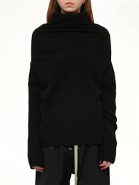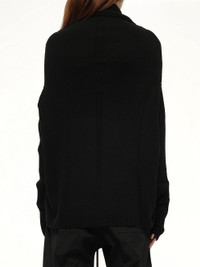 Rick Owens's Shroud Sweater in Black is a striking piece that embodies the designer's avant-garde aesthetic. This sweater features a unique silhouette that drapes elegantly, offering both comfort and style. - Composition: 100%Cashmere- - Color: Black - Unique draped silhouette - Long sleeves - Asymmetrical hem - Relaxed fit - Signature Rick Owens design - Made in Italy Model is 178 cm and wears size XS SKU: RP02E4674 KLWS 09