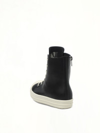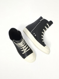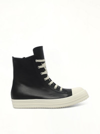 Rick Owens's Sneaks in Black/Milk/Milk is a bold statement in contemporary footwear. These sneakers combine avant-garde design with everyday functionality. - Composition: Upper 100%Cow Leather-Toe 100%Calf Leather-Lining 100%Calf Leather-Insole 100%Calf Leather-Sole 100%Thermoplastic Rubber- - Colorway: Black/Milk/Milk - High-top silhouette - Signature chunky sole - Lace-up closure - Distinctive geometric paneling - Comfortable fit for all-day wear - Made in Italy SKU: RU02E1890 LCO 911
