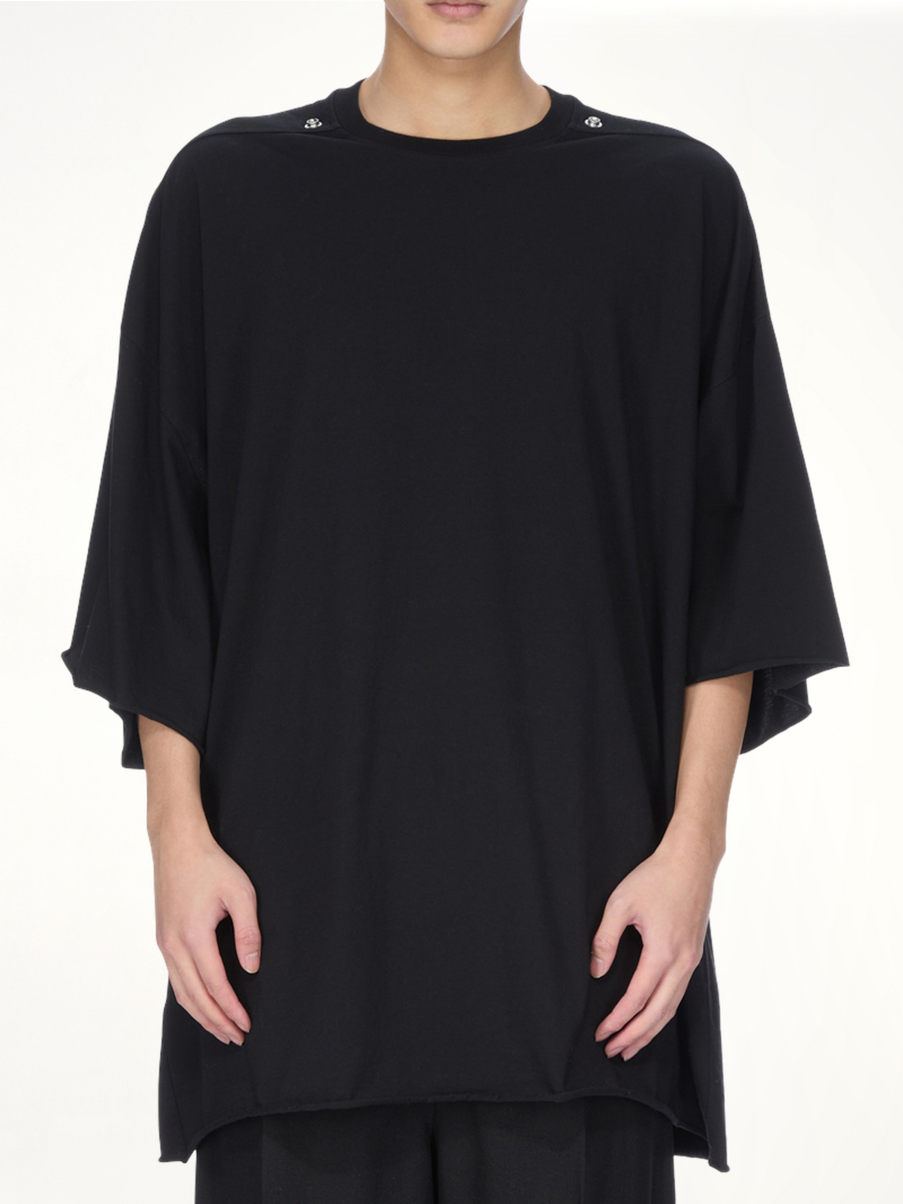 Rick Owens's Tommy T in Black is a sleek and versatile piece that embodies the designer's signature avant-garde aesthetic. Perfect for layering or as a standalone statement, this T-shirt offers both comfort and style. - Composition: 100% Cotton - Relaxed fit - Short sleeves - Minimalist design - Round neckline - Made in Italy SKU: RU02E1283 JAES2 09