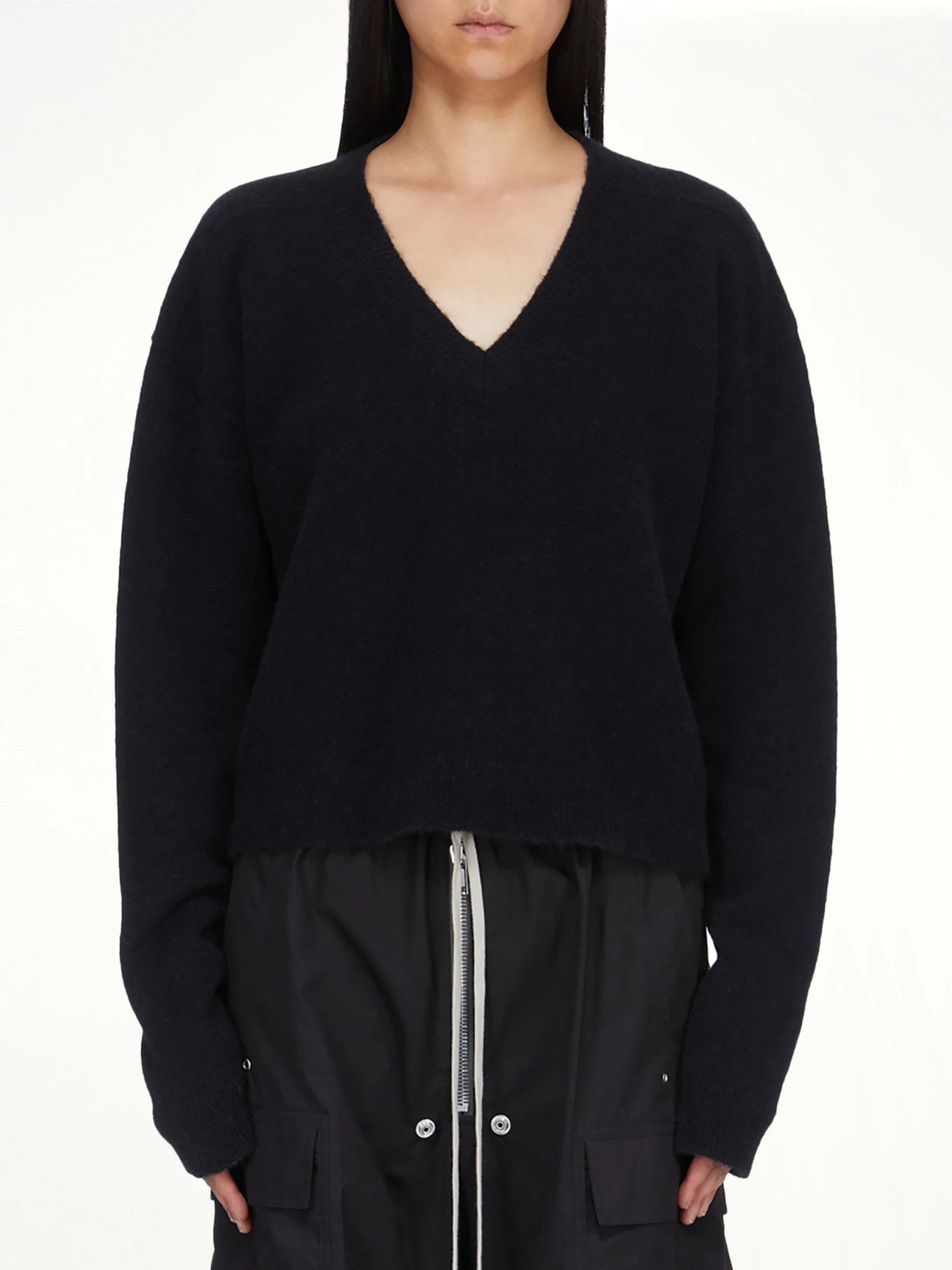 Rick Owens's Tommy V Neck in Black is a sleek and versatile piece that embodies the designer's signature avant-garde style. Perfect for layering or wearing on its own, this V-neck offers a modern silhouette with a touch of edge. - Composition: 48%Alpaca-30%Nylon-20%Wool-2%Elastane- - Classic V-neck design - Relaxed fit for comfort - Minimalist aesthetic - Suitable for various occasions - Easy to pair with other wardrobe staples - Made in Italy Model is 178 cm and wears size S SKU: RP01F6650 KWP 09