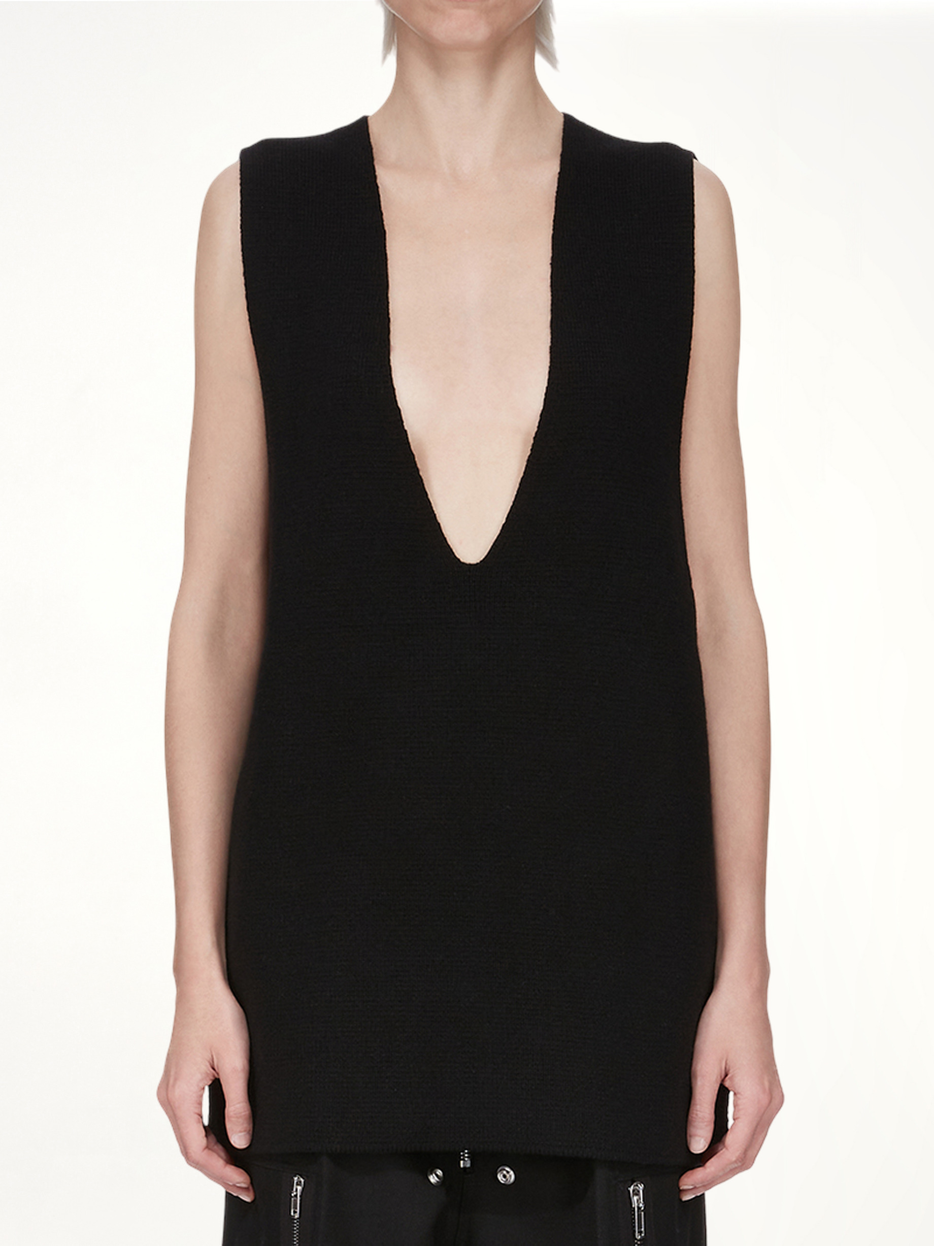 Rick Owens's V Tank Sweater in Black is a striking piece that combines avant-garde design with everyday wearability. Its unique silhouette and deep V-neckline make it a standout addition to any wardrobe. - Composition: 97% Cashmere -3% Wool - Deep V-neckline for a bold, modern look - Relaxed fit for comfort and style - Versatile black color for easy pairing - Signature Rick Owens design elements - Perfect for layering or wearing alone - Made in Italy SKU: RP02E4658 CHWSR 09