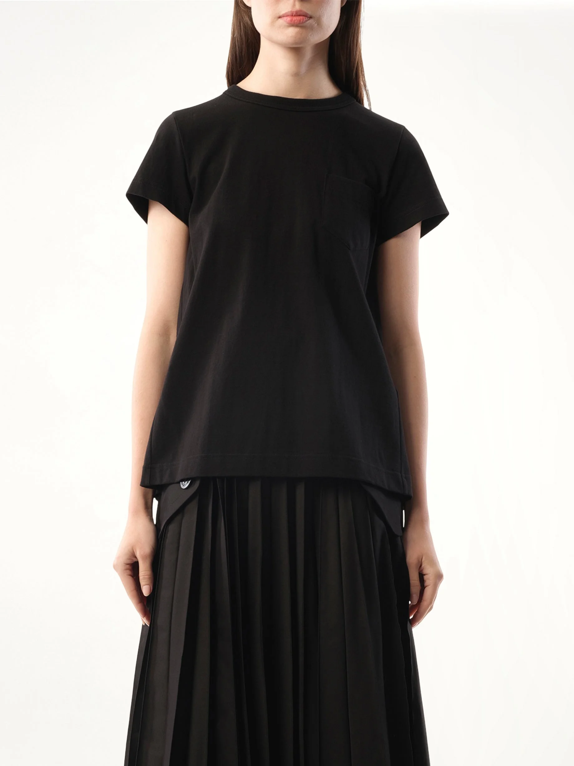 Made with a unique blend of cotton poplin and jersey fabric, this t-shirt offers both comfort and style. Perfect for any occasion, this versatile piece will elevate your look and keep you cool throughout the day. - Composition: 100% Cotton - Crew neck - Short sleeves - Chest patch pocket - High-low hem Model is 175 cm and wears size 2 SKU: SCW238 002