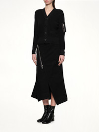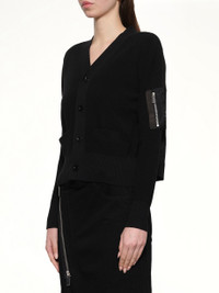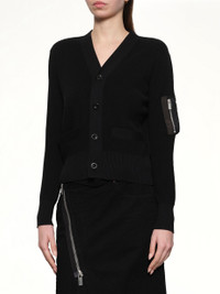 Sacai's Nylon Twill x Cotton Knit Cardigan in Black is a versatile piece that combines modern design with classic comfort. Perfect for layering, this cardigan offers a unique blend of textures and a sleek silhouette. - Composition: Cotton 57%, Polyester 43%, Attached Parts:Nylon 100% - Features a mix of nylon twill and cotton knit fabrics - Designed with a relaxed fit for easy layering - Includes front button closure for adjustable styling - Black colorway for a timeless and versatile look - Detailed with ribbed cuffs and hem for added structure - Made in - Model is 178 cm and wears size 1 SKU: 2508159 001
