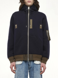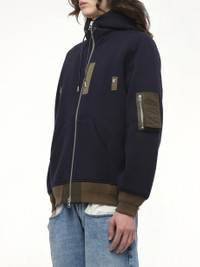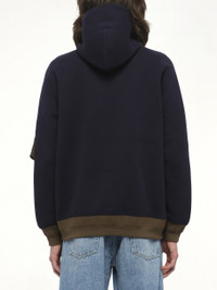 SACAI's Sponge Sweat Hoodie in Navy/Dark Khaki is a versatile and stylish addition to your wardrobe. This hoodie combines comfort with a modern aesthetic, perfect for any casual occasion. - Composition: Cotton 62%, Polyester 38%, Attached Parts:Nylon 100%, Polyester 55%, Cotton 44%, Polyurethane 1%, Filling:Polyester 100% - Color: Navy/Dark Khaki - Relaxed fit for everyday wear - Adjustable drawstring hood - Front kangaroo pocket for convenience - Ribbed cuffs and hem for a snug fit Model is 187 cm and wears size 2 SKU: 2503788M 233