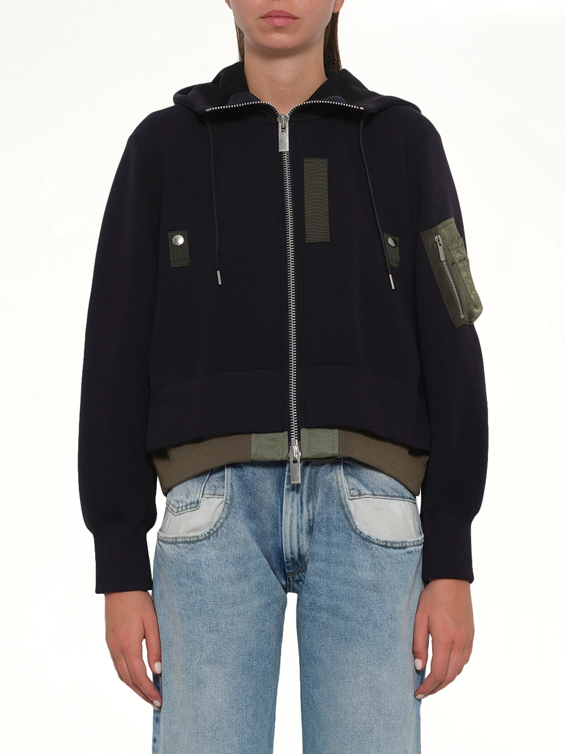 Sacai's Sponge Sweat x Nylon Twill Small Hoodie in Navy/Khaki is a stylish and versatile piece that combines comfort with a modern aesthetic. Perfect for layering, this hoodie offers a unique blend of textures and colors. - Composition: Cotton 62%, Pe 38%, Attached Parts:Cotton 100%, Nylon 100%, Pe 55%, Cotton 44%, Polyurethane 1%, Liner:Pe 100% - Features a contrasting navy and khaki color scheme - Designed with a relaxed fit for everyday wear - Includes a drawstring hood for adjustable coverage - Equipped with a front kangaroo pocket for convenience - Combines sponge sweat and nylon twill for a distinctive look - Made in Japan Model is 178 cm and wears size 1 SKU: SCW344 212