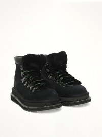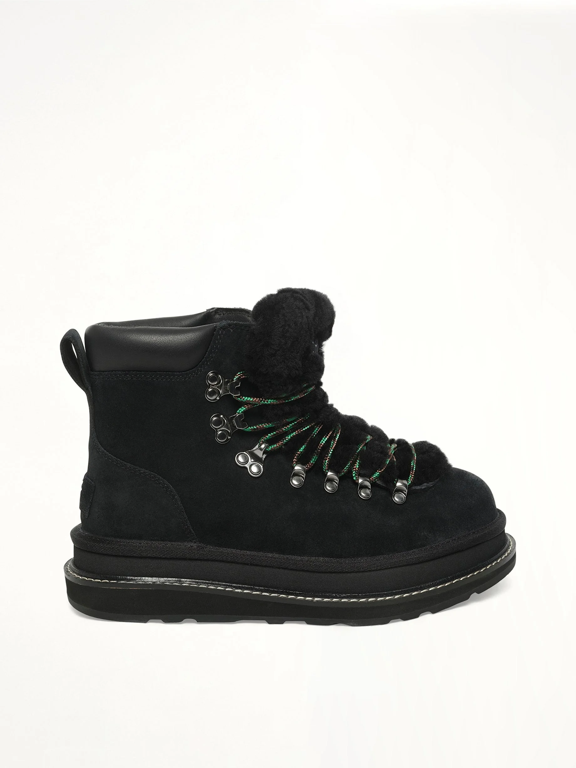 Sacai x UGG's UGG sacai Hiker in Black is a unique collaboration that combines the innovative design of Sacai with the classic comfort of UGG. This stylish hiker boot offers a modern twist on a traditional silhouette, perfect for urban adventures. - Composition: Suede, Upper is made with suede sourced from certified farms that practice regenerative agriculture upper / Midsole incorporates sugarcane EVA / Vibram® XS Trek Evo / Additional set of laces included - Features a sleek black colorway for versatile styling. - Designed with a rugged sole for enhanced traction. - Includes signature Sacai design elements for a distinctive look. - Offers the renowned comfort and warmth of UGG footwear. - Made in - SKU: 1178390-BLK