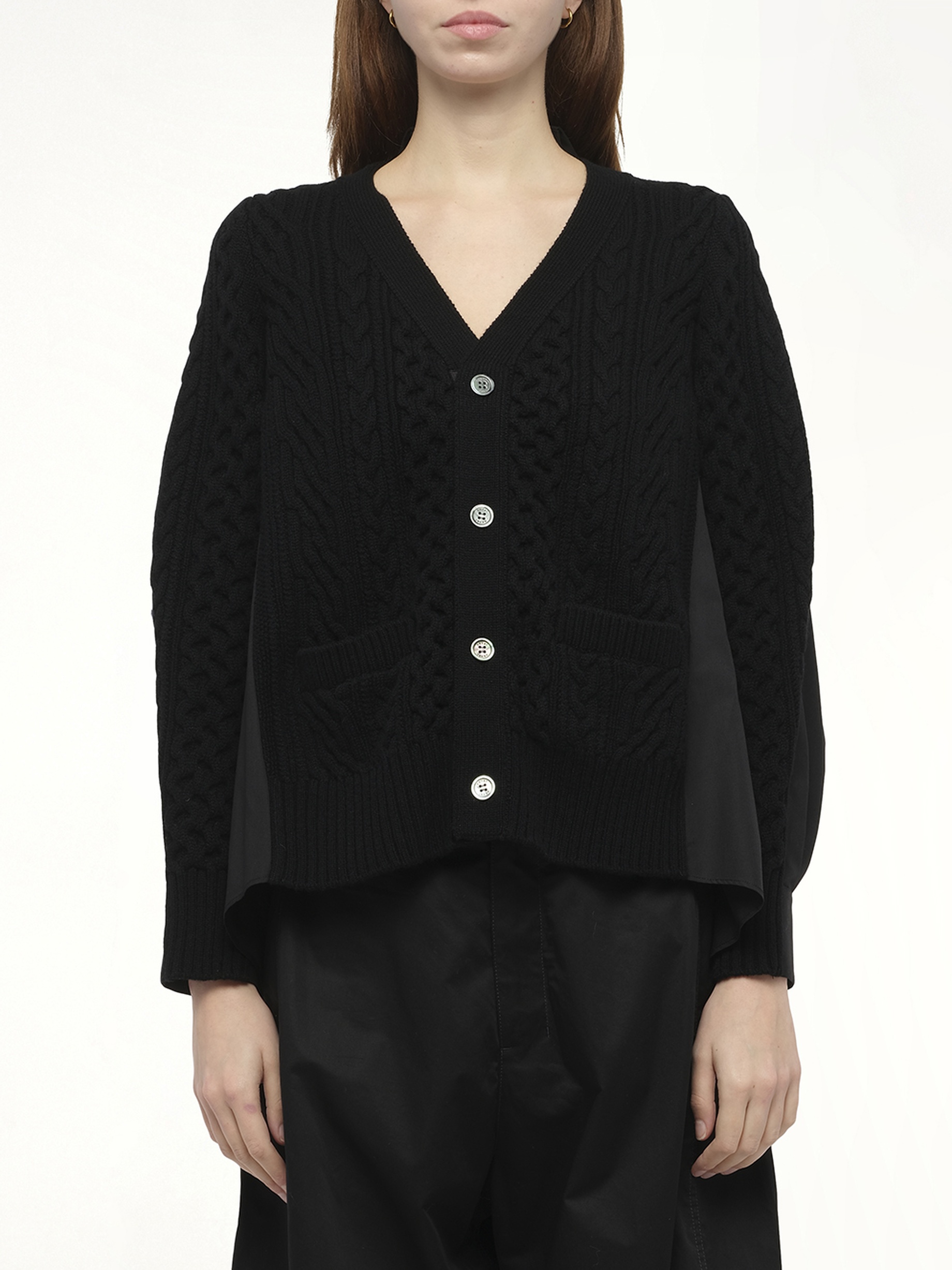 SACAI's Wool Knit x Cotton Poplin Cardigan in Black/Black is a sophisticated blend of textures, offering a unique and stylish addition to any wardrobe. This versatile piece effortlessly combines comfort and elegance, making it a must-have for any fashion-forward individual. - Composition: Wool 100%, Attached Parts:Polyester 65%, Cotton 35% - Contrasting wool knit and cotton poplin design - Classic black color for versatile styling - Relaxed fit for comfortable wear - Button-front closure for easy layering - Distinctive design details for a modern look Model is 178 cm and wears size 1 SKU: SCW254 002