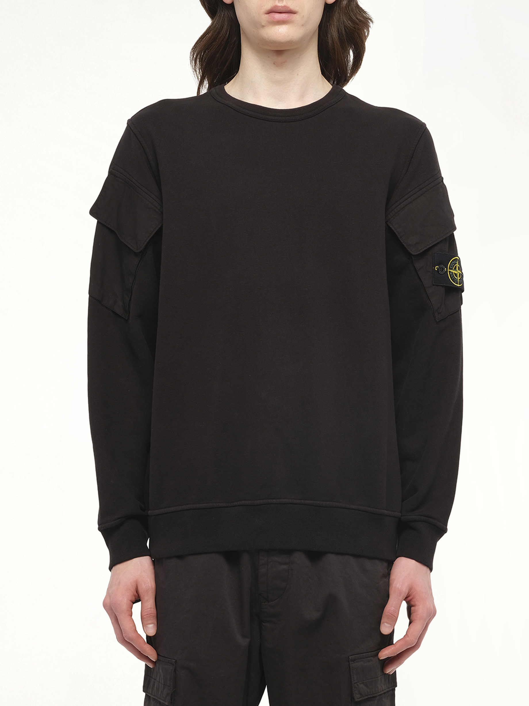 Stone Island's 610000 Cotton Fleece Sweatshirt in Black offers a perfect blend of style and comfort, making it an essential addition to any wardrobe. This versatile sweatshirt is designed with a sleek silhouette, ideal for both casual and semi-formal occasions. Elevate your fashion game with this timeless piece that embodies Stone Island's commitment to quality and innovation. - Composition: BRUSHED ORGANIC COTTON FLEECE, GARMENT DYED - Features the iconic Stone Island compass patch on the sleeve. - Ribbed cuffs and hem for a snug fit. - Available in a classic black color for easy pairing with any outfit. Model is 187 cm and wears size M SKU: 6100008S0A20 V0029