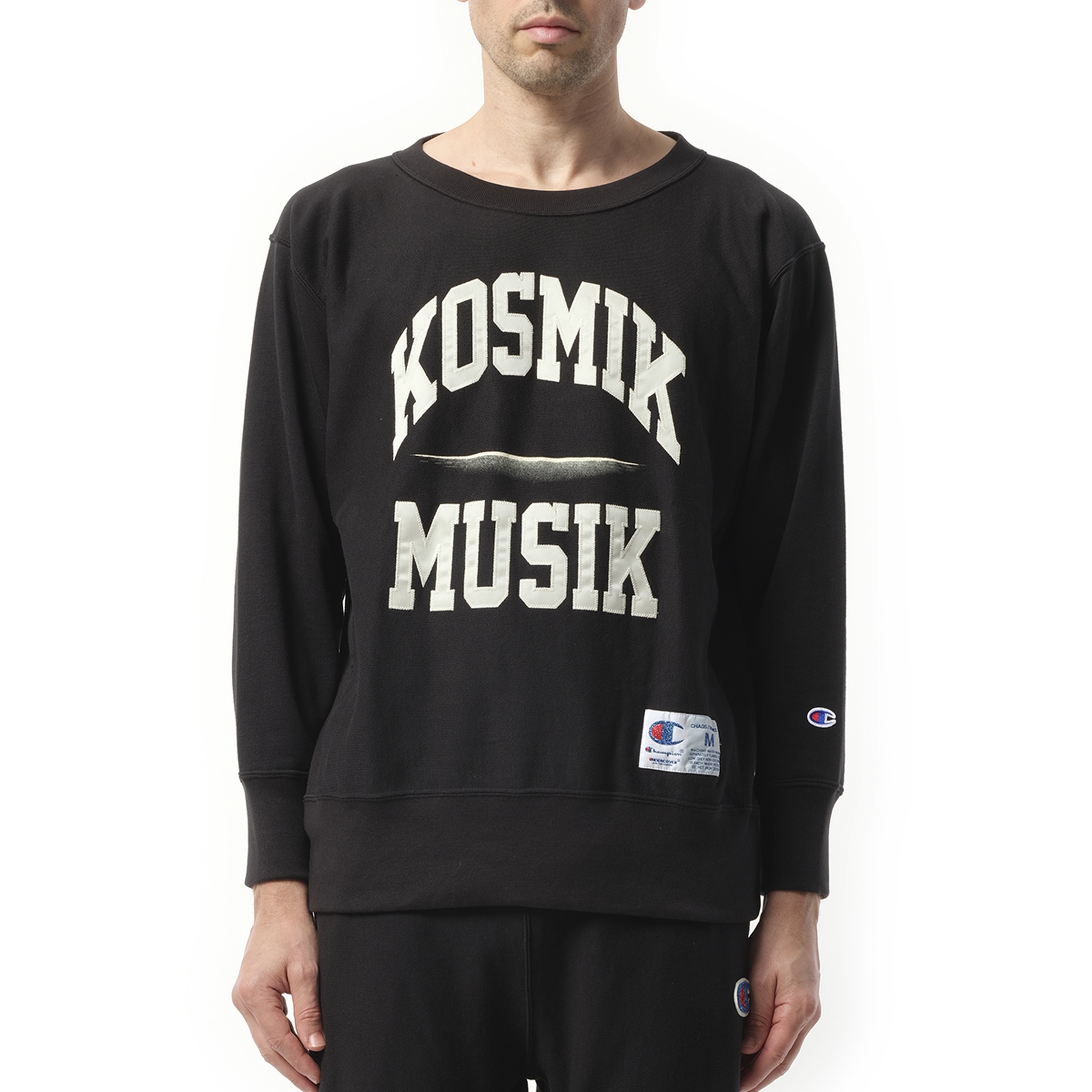 Introducing the Kosmik Musik Sweatshirt in Black, the perfect addition to your wardrobe. Crafted with high-quality materials, this sweatshirt offers both style and comfort. With its sleek black design, it's sure to make a statement. - Composition: 100% Cotton - Rib-knit crewneck, hem, and cuffs - Logo and text applique at front and sleeve - Graphic printed at front - Logo applique at front hem Model is 192 cm and wears size M SKU: UC1E4809 2