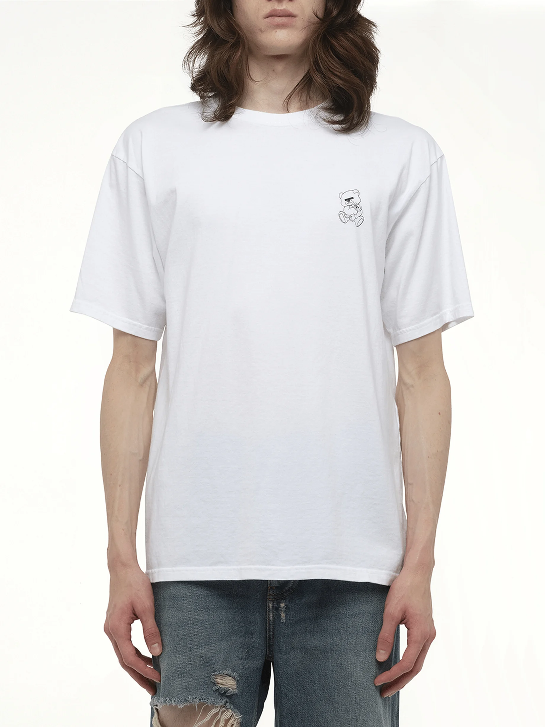 UNDERCOVER's Small Teddy Bear Printed T-Shirt in White is a playful yet stylish addition to any wardrobe. Perfect for casual outings, this tee combines comfort with a touch of whimsy. - Composition: 100% Cotton - Features a charming small teddy bear print on the front - Classic crew neck design - Short sleeves for a relaxed fit - Versatile white color for easy pairing with other items Model is 187 cm and wears size 3 SKU: UB0D3804 WH