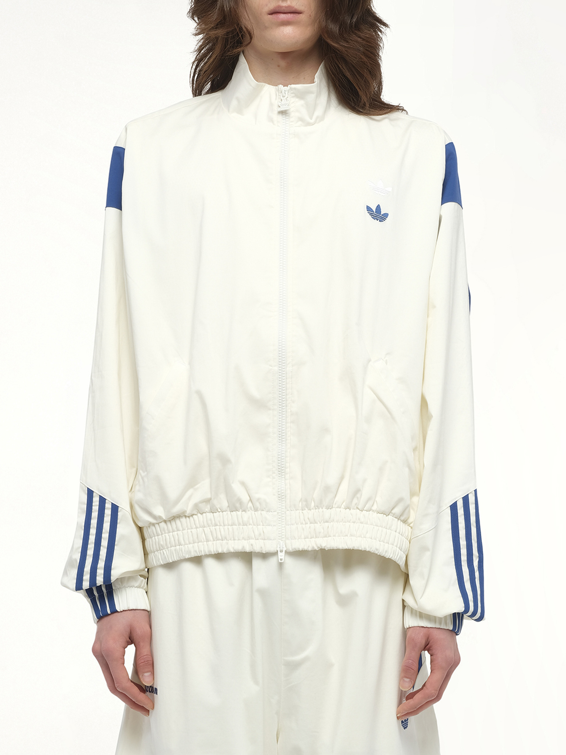 adidas x chavarria's Poplin Track Top in Off White reinterprets the classic track silhouette through a refined, voluminous lens. Crafted in crisp poplin, it merges tailored construction with bold proportions. A modern statement layer that elevates everyday sport-inspired dressing. Composition: Plain Weave Poplin 97% Cotton, 3% Elastane Oversized fit with exaggerated sleeves and body Embroidered double Trefoil logo at chest “Willy Chavarria” embroidery at back neck 3-Stripes detailing on sleeve cuffs Front welt zip pockets Zip front fastening SKU: KC0539