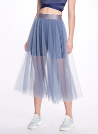 The Anne Skirt is a faultless tea-length addition to a layered look, featuring tiered weightless tulle, and a wide elastic waistband creating a high rise look. This is an extremely versatile garment; it is perfect for dance-related exercise, such as barre, or dance classes, and can also be worn as an everyday skirt, paired with running shorts or leggings. The sheer, tulle material and zen blue color adds a romantic and graceful element to this garment that extends its wear outside the gym. Details Pictured in Zen Blue Tiered weightless tulle Athleisure Tea-length skirt Style ID: MA04604