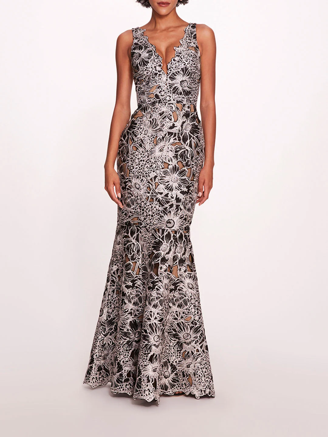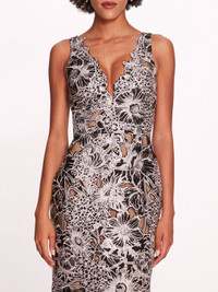 The Anthousai Gown is a plunging v-neck gown with a fit-to-flare silhouette on anthousai cutwork fabric. Sizing and Fit • Silhouettes are designed to fit true to size, following a classic American fit. • Clients familiar with European sizing may wish to consider sizing down for a closer fit. • Many styles are crafted from exquisite woven fabrics, often adorned with delicate embellishments, and are intended to maintain their structure without stretch unless otherwise specified. • For bespoke sizing guidance or personalized assistance, our concierge team is delighted to help at concierge@marchesafashion.com.