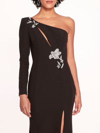 The Beaded Floral Gown is a one sleeve column gown crafted with 4-way stretch crepe and features an asymmetrical neckline, open keyhole detail, high leg slit, and finished with crystal beaded flower appliques. Sizing and Fit • Silhouettes are designed to fit true to size, following a classic American fit. • Clients familiar with European sizing may wish to consider sizing down for a closer fit. • Many styles are crafted from exquisite woven fabrics, often adorned with delicate embellishments, and are intended to maintain their structure without stretch unless otherwise specified. • For bespoke sizing guidance or personalized assistance, our concierge team is delighted to help at concierge@marchesafashion.com.