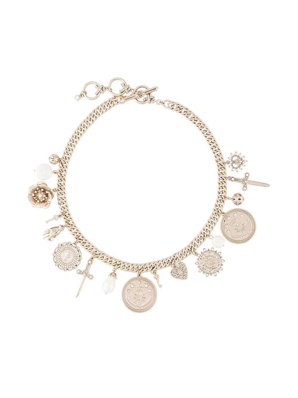 Add a timeless piece to your collection with this Charm Front Statement Necklace. Features radiant gold pendants, exquisite charms, an enchanting pearl embellishment and a T-bar fastening. Details Gold Plated Brass Charms Metal (Other), Glass Imported Style ID: 3603A