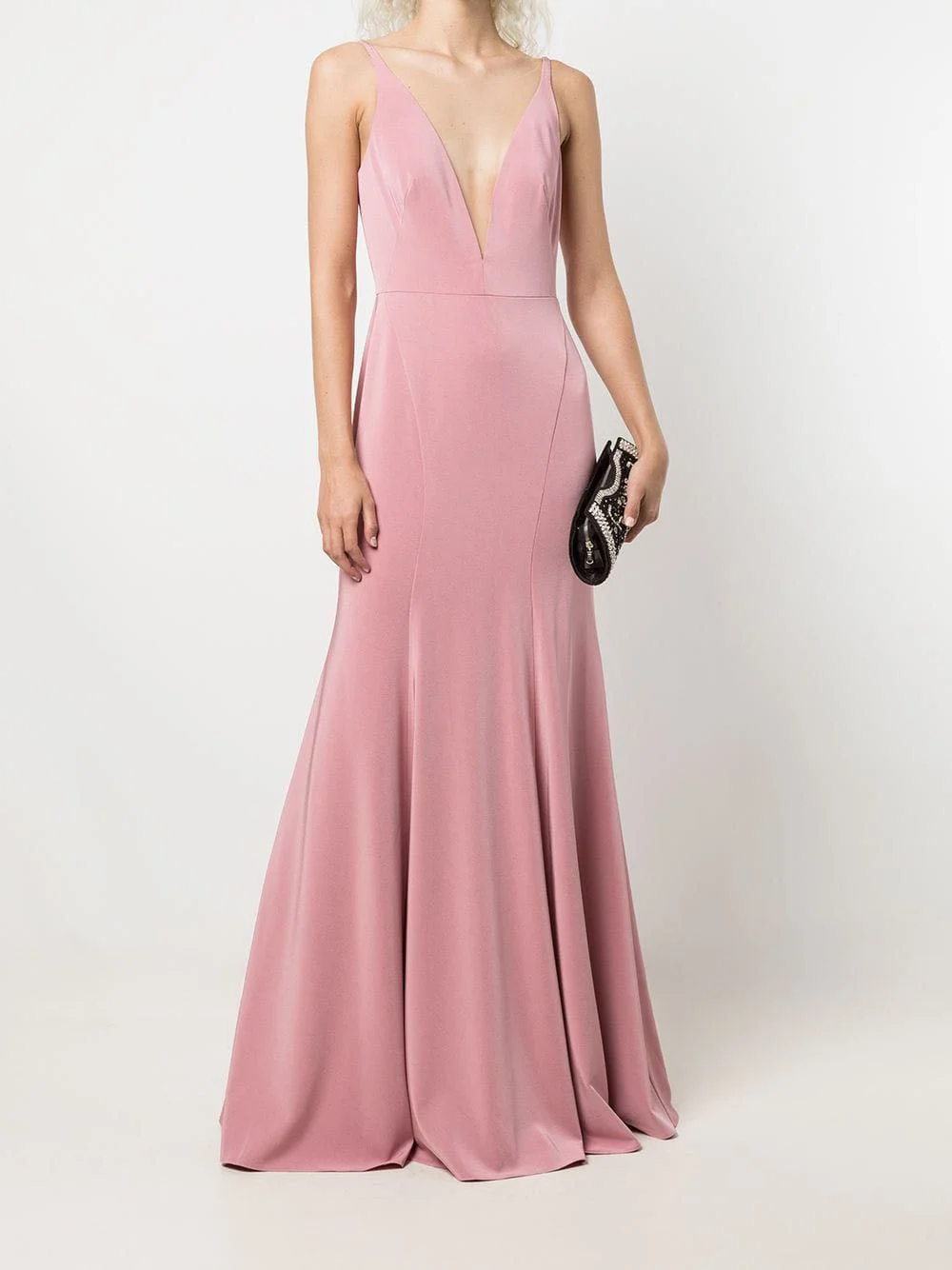 The Crema gown in rose is simple and classy. The fit-to-flare gown features a deep v-neckline and a low-cut back. The flow of the fabric combined with a plunging neckline implies a subtle yet eye-catching feel.