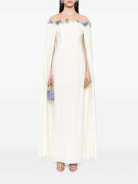 The Embroidered Illusion Gown is composed of crepe and features an tulle illusion neckline adorned with embellishments, a column silhouette, and cape effect. This item will ship in 7–10 business days Details Pictured in ivory 87% polyester, 13% spandex Dry clean only Style ID: N63G3052