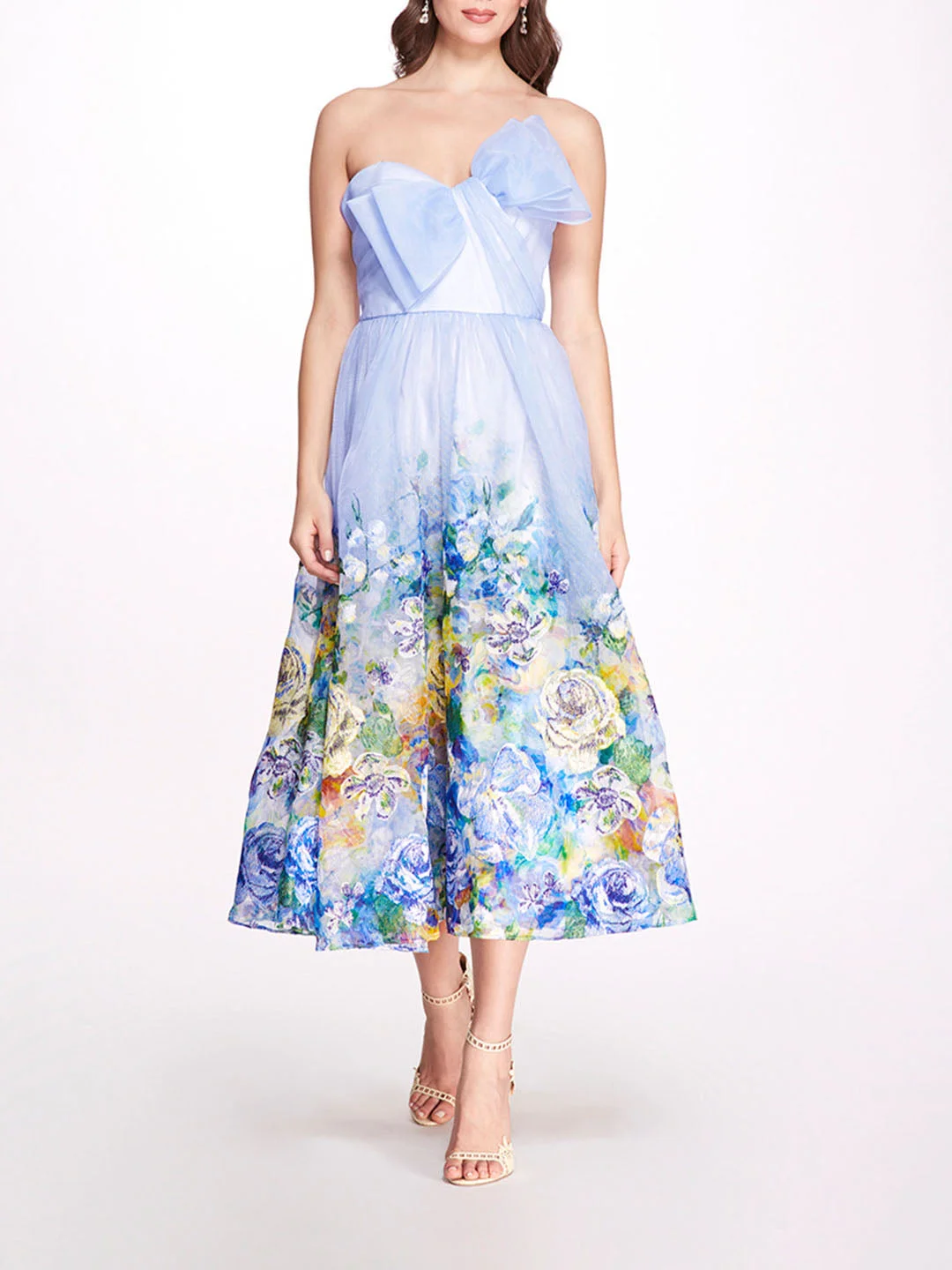 This organza midi dress features a dynamic bow across a strapless sweetheart bodice. With a charming a-line silhouette, the dress is printed with watercolor roses and finished with floral embroidery scattered along the skirt. This item will ship in 7–10 business days Details Pictured in blue/yellow 100% polyester Dry clean only Style ID: N65M3402