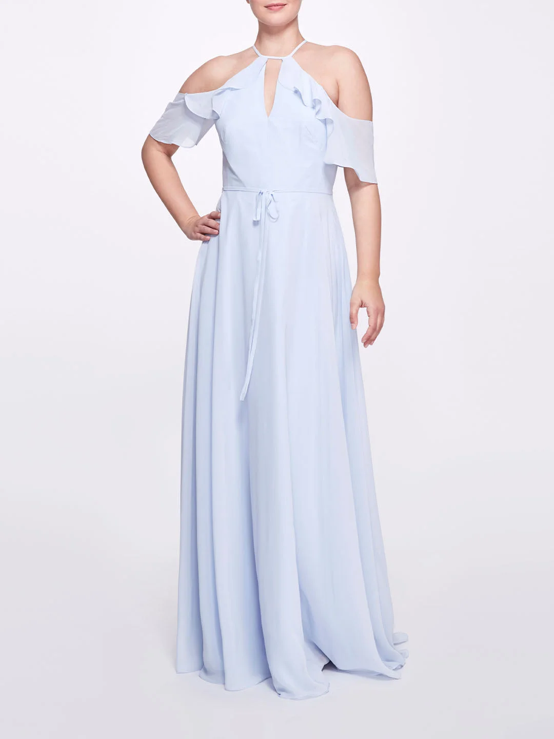 The Ferrara gown is unique and exquisite. In ice blue, this gown features a cold-shoulder chiffon gown, a halter neck, a waist tie, and ruffle sleeves. Details Pictured in Ice Blue Cold Shoulder Halter Neck Dropped Short Sleeve Waist Tie Ruffle Trim Dry Clean Imported 100% Polyester Style ID: BM1113