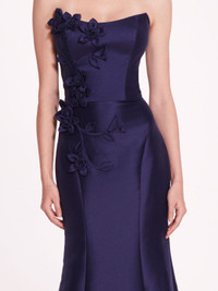Step into a fairytale with the Floral Mikado Gown, a blend of timeless elegance and whimsical charm. Crafted from silk mikado, this strapless mermaid gown features cascading 3-D flower appliques, creating a captivating, romantic silhouette. Details Pictured in navy 15% silk, 38% polyester, 47% cotton Dry clean only Style ID: N75G3752