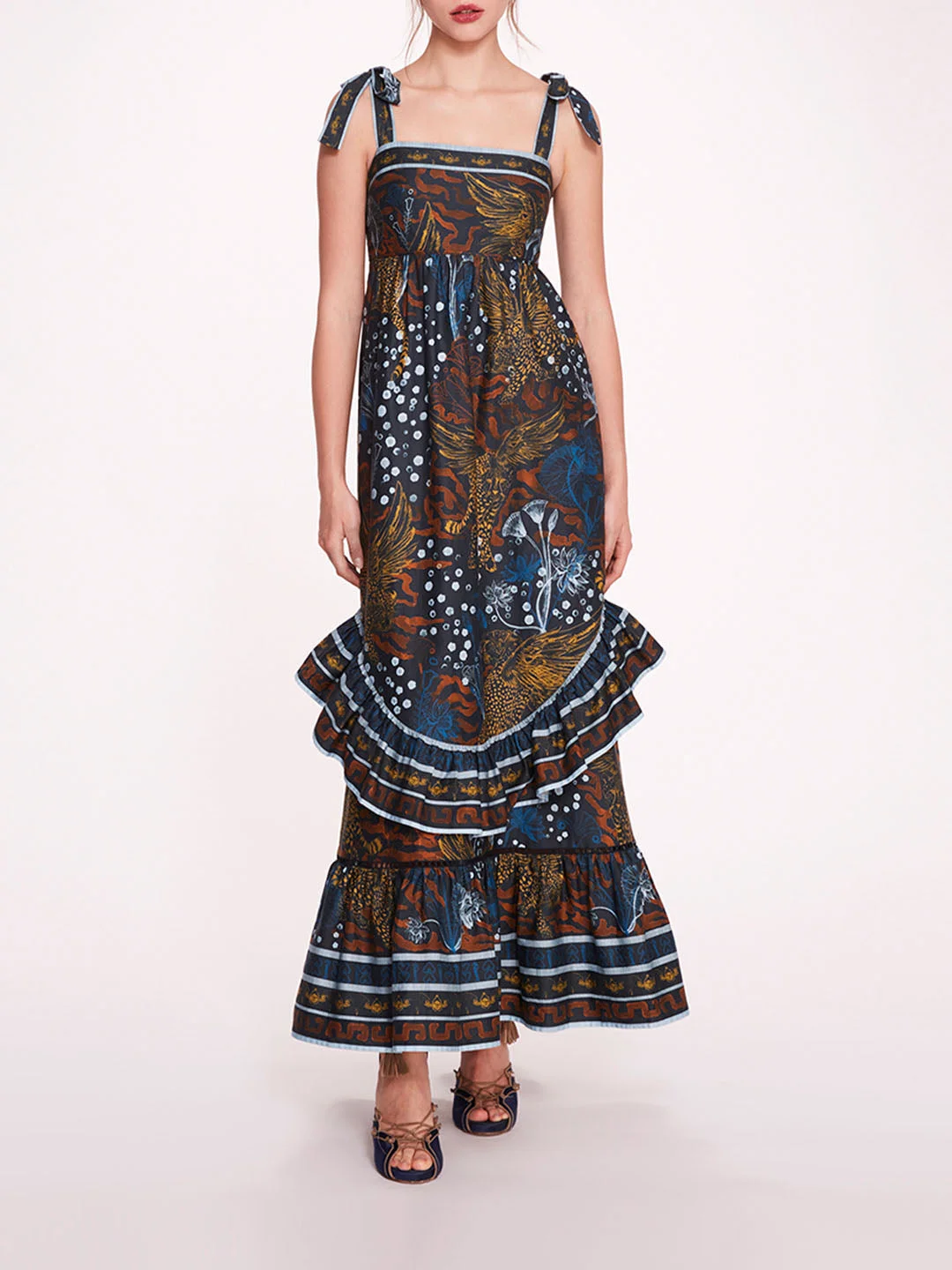 The Flying Cheetah Maxi Dress enchants with its captivating details, adorned with cascading ruffles and adjustable tied shoulder bows. Crafted from poplin printed with winged leopards and abstract watercolor animal print, the sleeveless maxi dress is complete with smocking details. Details Pictured in blue multi 100% cotton Dry clean only Style ID: R74DL3711
