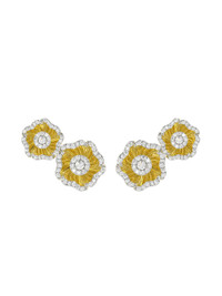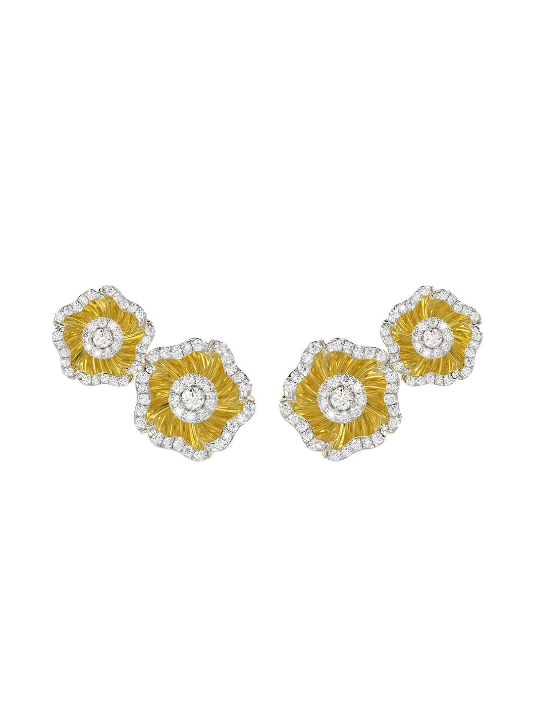 The Halo Flower Yellow Gold Earrings feature a duo of yellow gold and natural diamond camellia-inspired flowers, complete with a natural diamond at the center of each flower. Details Pictured in yellow gold 18KT 0.77 cts VS2/SI1 Style: MVE90021