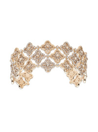 The Lace Cuff Bracelet is a lattice of pave stars. Translucent crystals adorn the cuff, making for a thoughtfully detailed piece. The statement bracelet is gold plated with a gold tone. Details Pictured in gold One size Style ID: 16B00069