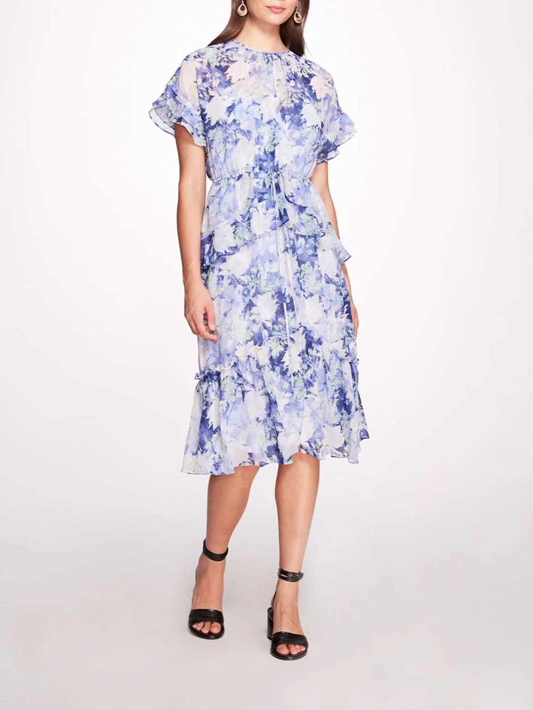 The Lita dress in navy multi is the perfect combination of elegance and comfort. This printed lightweight satin chiffon dress features a drawstring waist and a round neck, making it both flattering and comfortable for all body types. The delicate ruffled detailing adds a feminine touch, making it the perfect dress for any outing. Model is wearing size US 0. Details Pictured in navy multi 100% polyester Style ID: R64DM3325