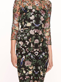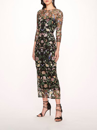 Crafted with thread embroidery on tulle, the Long Botanical Embroidered Midi Dress is a column silhouette midi dress featuring a long sleeve bodice and boat neckline. Hidden with butterflies, the dress is complete with symmetrical botanical embroidery. Sizing and Fit • Silhouettes are designed to fit true to size, following a classic American fit. • Clients familiar with European sizing may wish to consider sizing down for a closer fit. • Many styles are crafted from exquisite woven fabrics, often adorned with delicate embellishments, and are intended to maintain their structure without stretch unless otherwise specified. • For bespoke sizing guidance or personalized assistance, our concierge team is delighted to help at concierge@marchesafashion.com.
