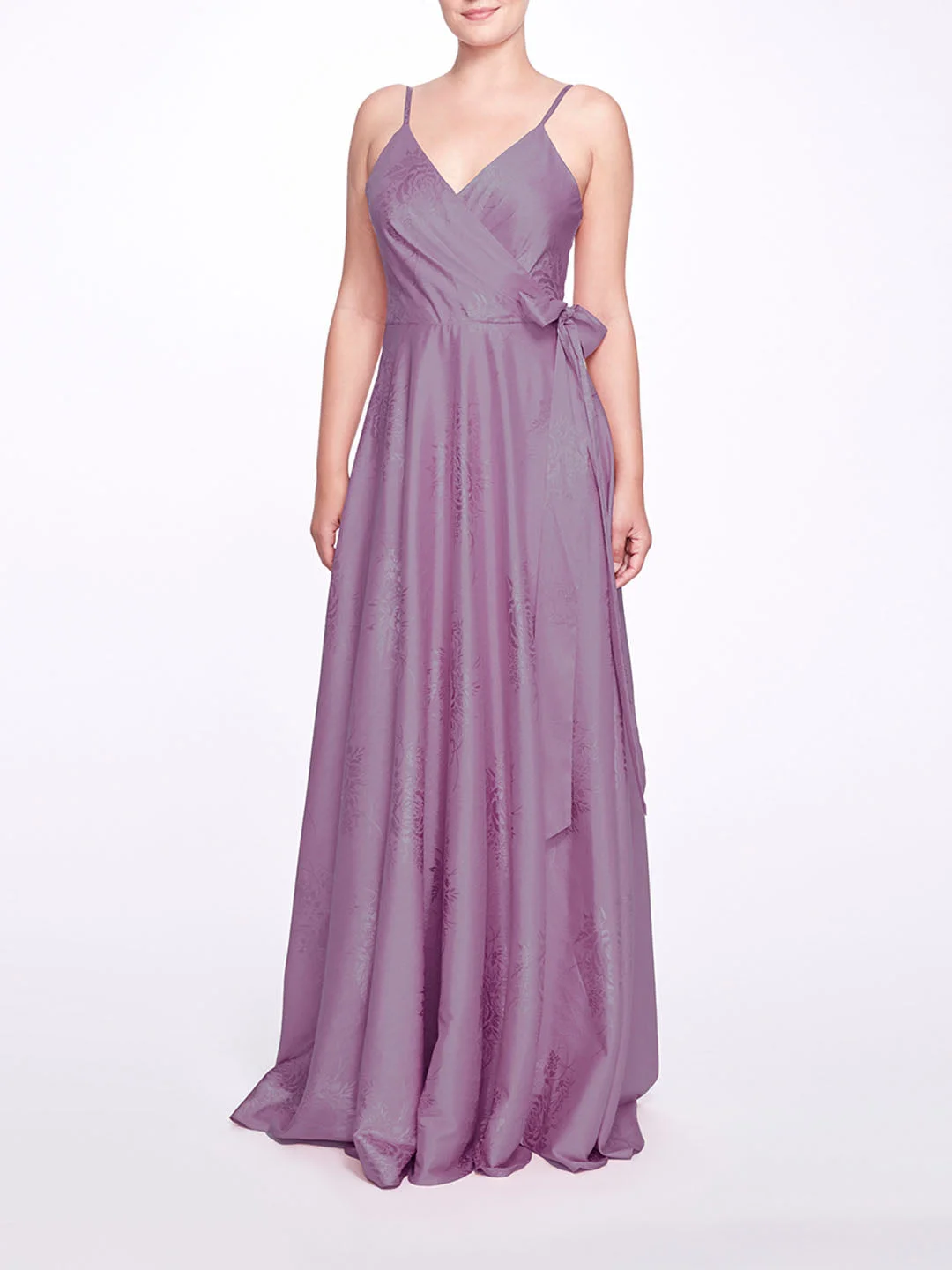 The Matera gown is bold and beautiful. Featuring a wrap neckline and a subtle floral pattern, this dress is elegance personified.