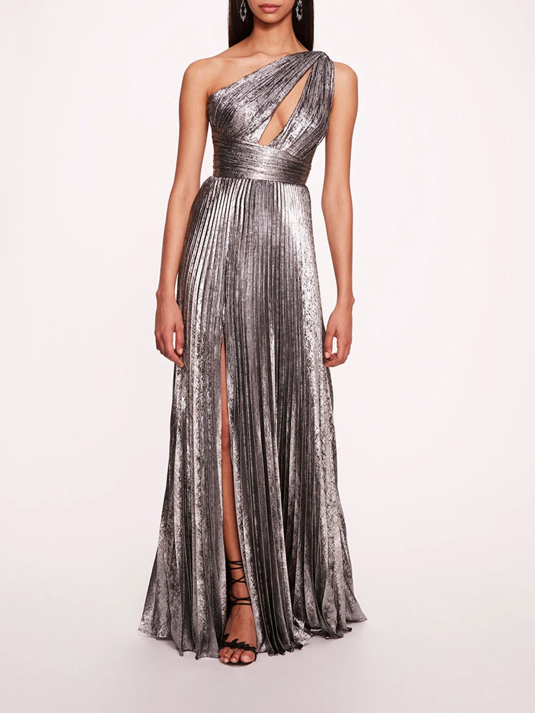The Metallic Lame Pleated Gown features a striking one-shoulder design with sharp knife pleats that create a dramatic, sculptural effect. A keyhole bodice detail and front slit add an alluring touch.