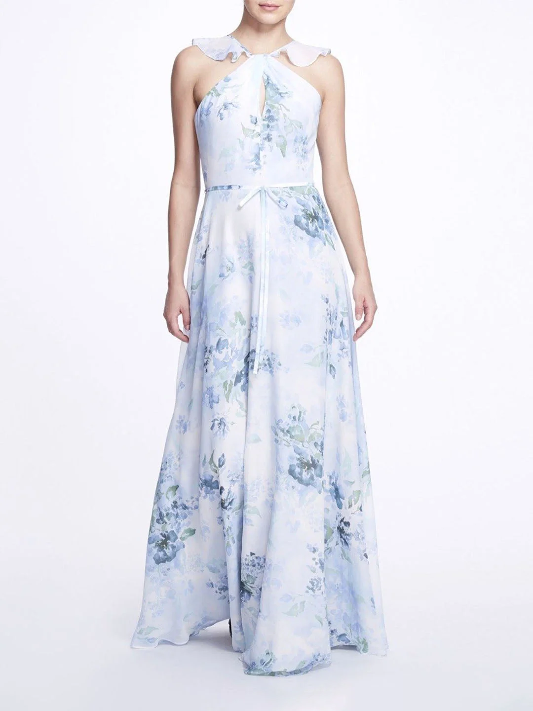 Step out in the effortless Pavia gown in dusty blue. Featuring delicate chiffon, a charming halter neck with ruffle detail, a subtle keyhole neckline, and a dainty bow around the waist, this dress is delicate and feminine. Details Pictured in dusty blue Tulle Halter Neck Ruffle Detail 100% Polyester Dry Clean Imported Style ID: BM1151