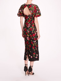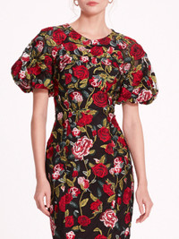 Make a statement in the Roses Tulle Midi Dress. With its bubble-sleeved and delicate embroidery on tulle, complemented by an open keyhole back detail and round neckline, this tea-length dress exudes timeless elegance, perfect for garden parties and cocktail events.