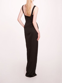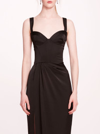 Make a bold statement in the Satin Bustier Gown, featuring a sleeveless design and exquisite bustier detailing. The sleek satin fabric is complemented by elegant ruched draping, creating a flattering and sophisticated look. Details Pictured in black 100% polyester Dry clean only Style ID: N76G3788