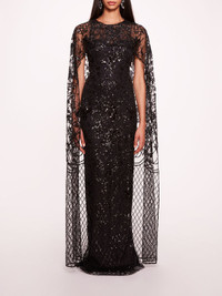 The Sequin Lattice Cape Gown features a stunning floor-length cape, adorned with intricate geometric floral lattice detailing. The combination of shimmering sequins and dramatic cape creates a bold yet elegant look, perfect for making a statement at any gala or formal event. Details Pictured in black 100% nylon Dry clean only Style ID: N78K3855