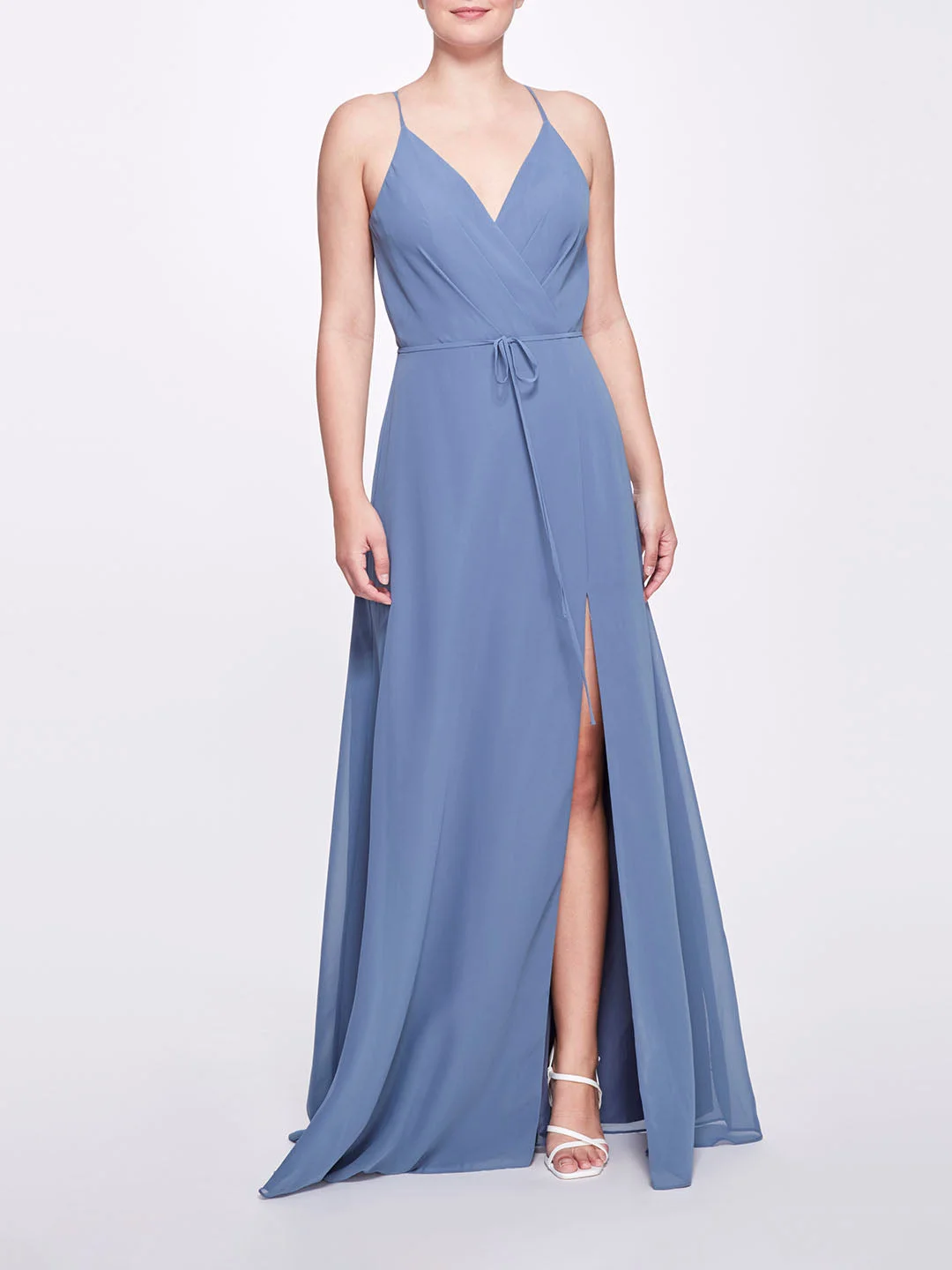 The Sessa gown in slate blue blurs the line between geometric and organic shapes. The v-neck drape halter gown features a triangular cutout on the back, a single mid-thigh leg slit, and finished with an elongated waist tie to give notice to the natural curve of your figure. Details Pictured in Slate Blue 100% polyester Wrap Neckline Sleeveless Back Cut-Out Waist Tie Imported Style ID: BM1127