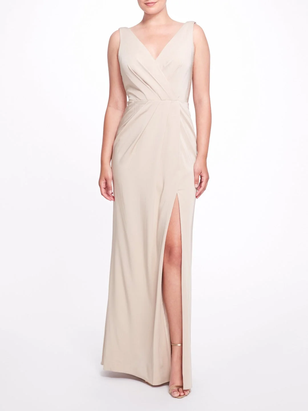 The Turin gown in champagne was thoughtfully designed. Featuring a stunning draped silhouette, an appealing leg slit, and a beautiful cowl back detail, this dress is simple and stunning. Details Pictured in Champagne 92% polyester, 8% spandex Drape Silhouette Frontal Leg Slit Sleeveless Style ID: BM1160