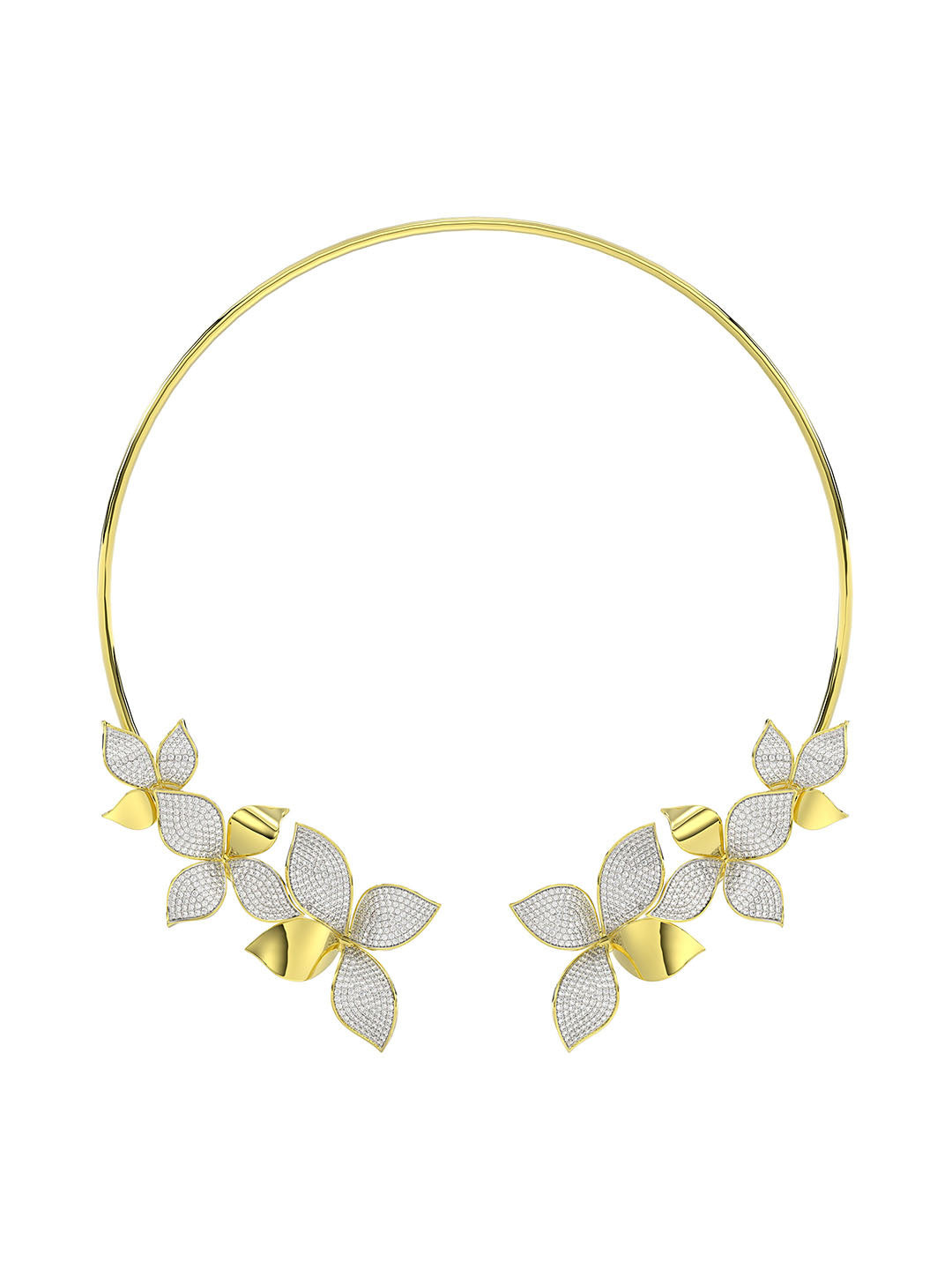 The Wild Flower Yellow Gold Necklace is a solid yellow gold open collar adorned with dynamic teardrop-shaped diamond and yellow gold flowers at either end. Details Pictured in yellow gold 18KT 4.79 cts VS2/SI1 Style: MVN90020