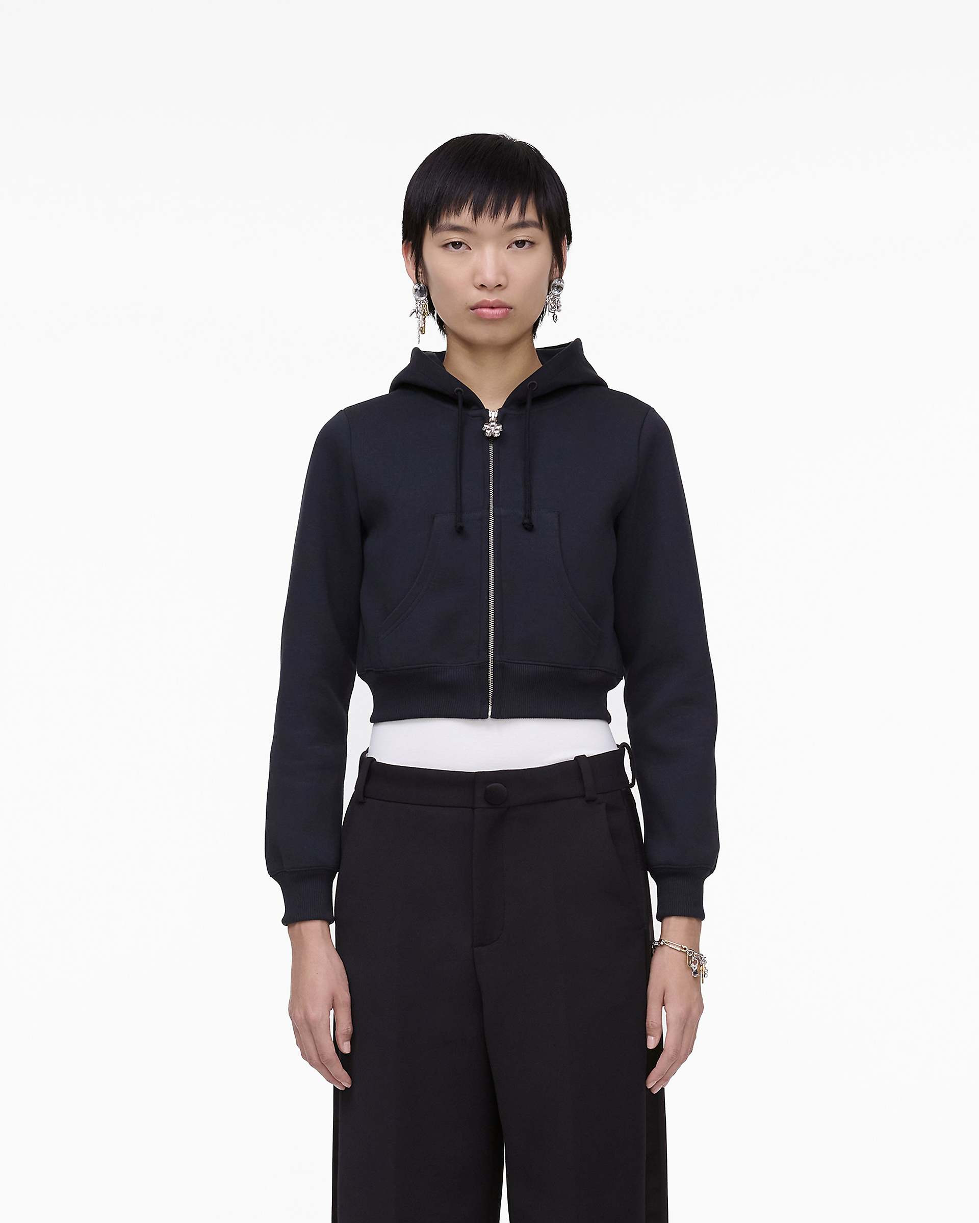 Description A true Runway-to-Reality takedown from Marc’s iconic Fall’24 Collection, this doll-inspired silhouette is high-style functionality embodied. Featuring a slightly puffed sleeve, a cropped feminine fit and a puffed daisy metal zipper pull, this everyday essential embraces the classic details of a zip-up hoodie with its stylized kangaroo pockets, fabric pull-strings and pull-up hood. 2S5RTP086C06 Features 100% Cotton Runway inspired hotfix crystal logo at back Ribbed sleeve cuffs and hem, kangaroo pockets, drawstring hood, volume sleeves Sizing Designed for a cropped fit Taken from size S bust 37.0" length 17.3" sleeve length 23.4"