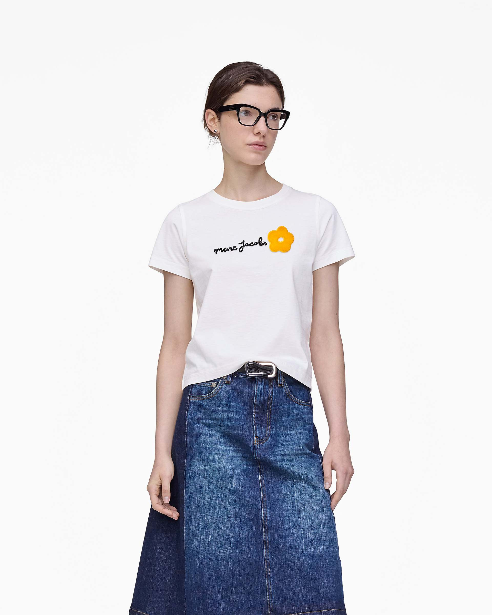 Description A fresh take on a signature staple, the Daisy Logo Slim Tee blends runway charm with everyday wearability. Crafted from lightweight stretch jersey, it features a daisy motif inspired by runway, and an embroidered Marc Jacobs logo at the chest. A rubberized logo at the back neck adds a modern, branded finish. 2F5RTP081C12 Features 100% Cotton Sizing Standard fit. Fits true to size. Men may want to size up. Model is wearing size Small Height: 5'10" 1/2 Bust: 31.5" Waist: 23" Hips: 34"