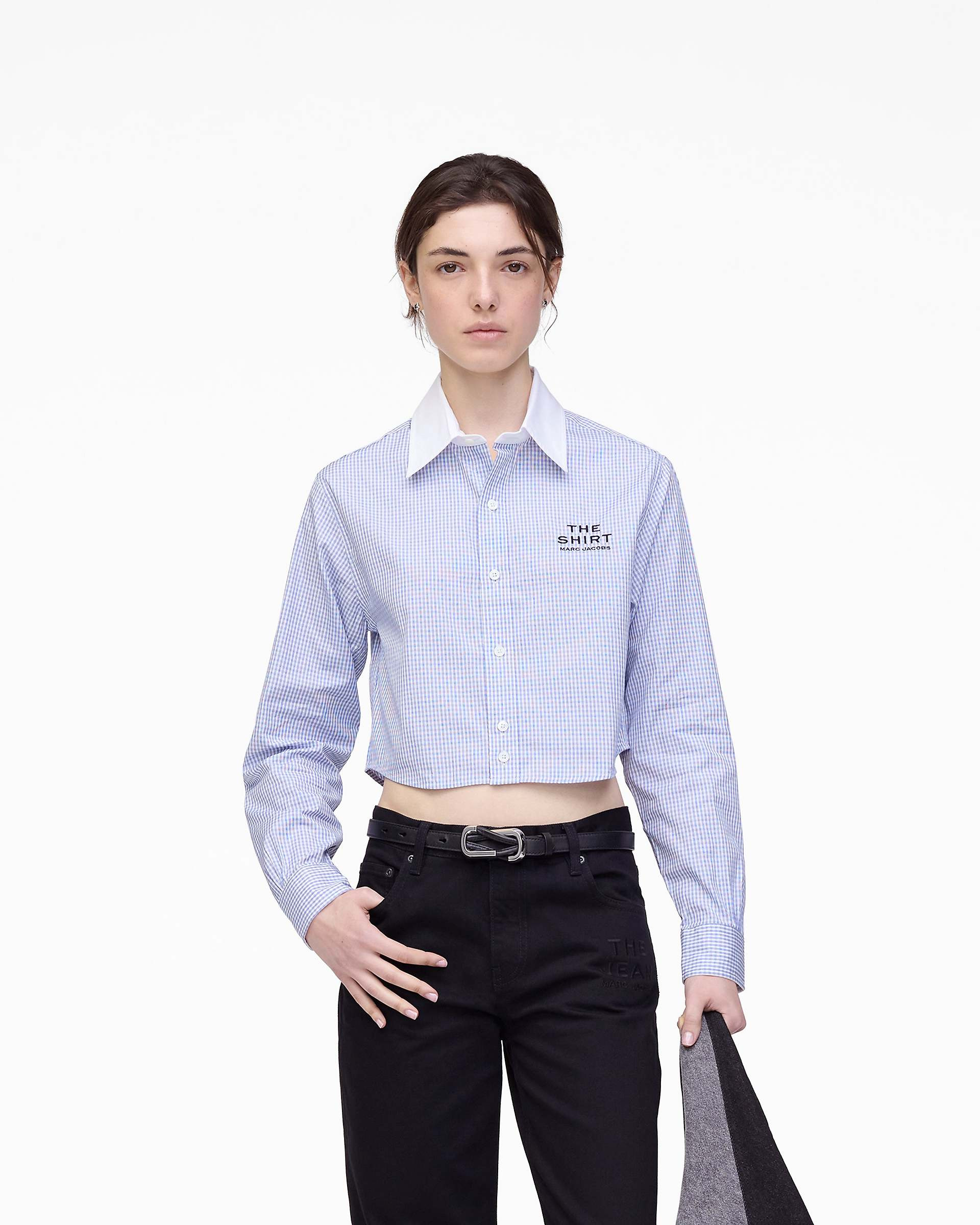 Description The Cropped Femme Shirt is crafted from crisp cotton shirting in a shrunken, cropped fit. Mother-of-pearl buttons and tiny pleated tucks at the cuffs add a dainty, refined finish. Featuring a fresh gingham pattern, it showcases ‘THE SHIRT’ and ‘MARC JACOBS’ embroidery at the chest, tying back to our signature namesake branding. A box pleat at the center back creates a sharp, tailored silhouette. 2F5RTP066W06 Features 100% Cotton Sizing Shrunken, cropped fit. Size up for a more relaxed fit. Model is wearing size Small Height: 5'10" 1/2 Bust: 31.5" Waist: 23" Hips: 34"
