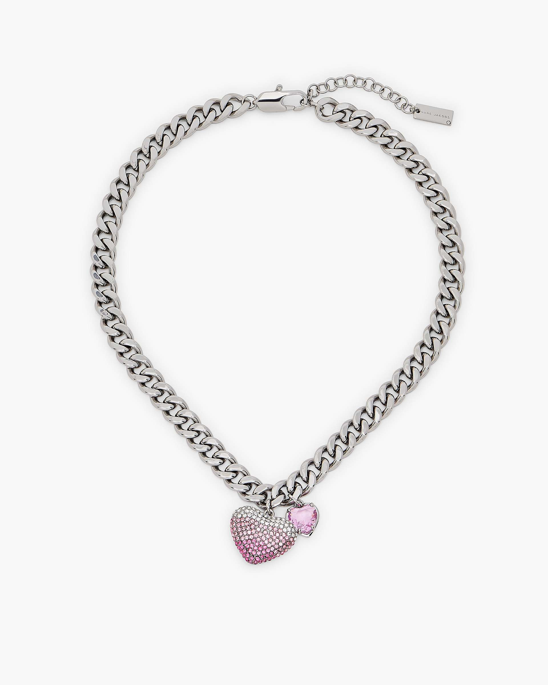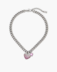 Description This necklace blends bold sophistication with playful charm, featuring a pave heart on a chunky chain, paired with a delicate companion heart. The lobster clasp ensures a perfect fit, ideal for both daytime and evening looks. 2P5JNC001J08 Features Plated Brass Glass stones 100% nickel free Lobster clasp closure Shipped in our signature yellow gift box with custom monogram dust bag Dimensions Base Length: 16" (41cm) Extender: 1.9"" (5cm) Pendant: 24mm x 19mm